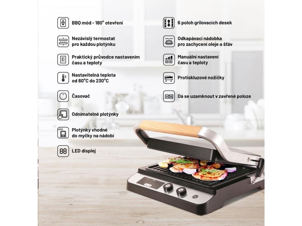 Gril je vybaven i funkcí automatického vypnutí, díky vysokému výkonu se velmi rychle rozehřeje a o průběhu přípravy máte přehled díky LED displeji. V nabídce jsou i ploché plotýnky pro ještě širší možnosti grilu.
