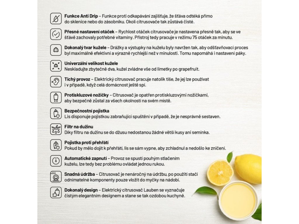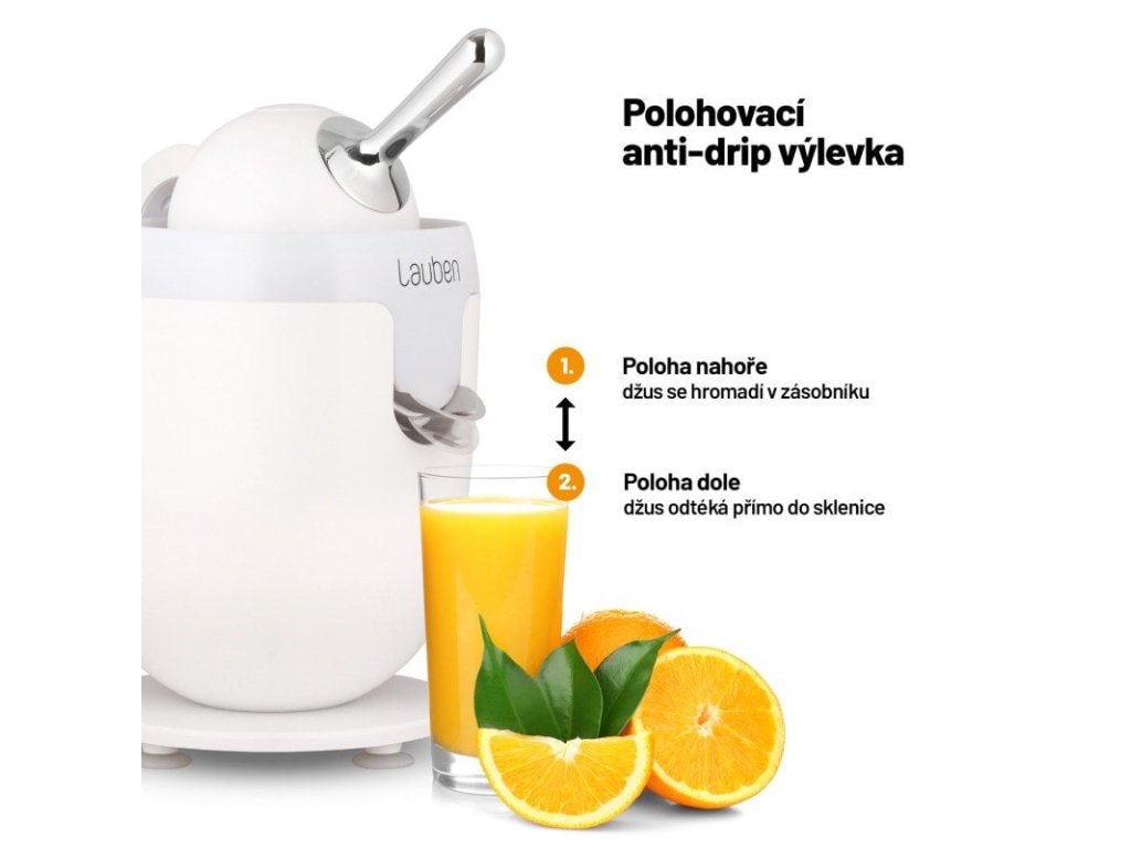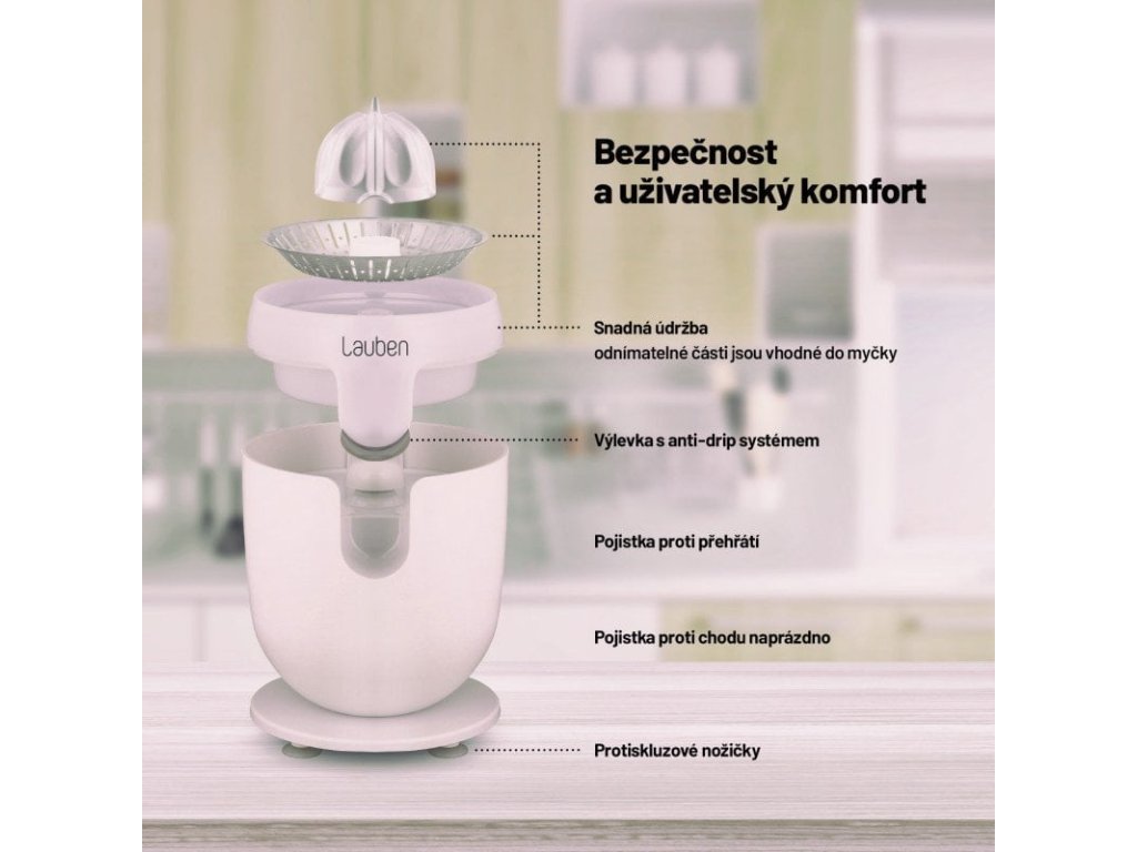 Vyznavačům zdravého životního stylu nesmí doma chybět pomocník v podobě elektrického citrusovače Lauben Electric Citrus Juicer 110WT. Jeho čistý design ozdobí každou kuchyňskou linku, kterou díky funkci Anti Drip nepotřísní ani kapka šťávy. Funkce proti odkapávání zajišťuje, že džus odtéká přímo do sklenice či zůstává v zásobníku. Rychlost otáček při odšťavňování je nastavena tak, aby si šťáva uchovala maximum vitamínů. Chuť navíc není nijak ovlivněna, neboť části dotýkající se ovoce jsou nerezové či z plastu splňujícího nejpřísnější nařízení EU a neuvolňují tak žádnou pachuť ani aroma. Tvar kužele a nastavení páky proces odšťavňování zefektivňují a tichý provoz umožňuje přípravu džusu v jakoukoliv hodinu. Bezpečný provoz zajišťují protiskluzové nožičky a pojistka zabraňující spuštění, není-li lis správně sestaven. Jistě potěší i snadná údržba, odnímatelné části stačí vložit do myčky.