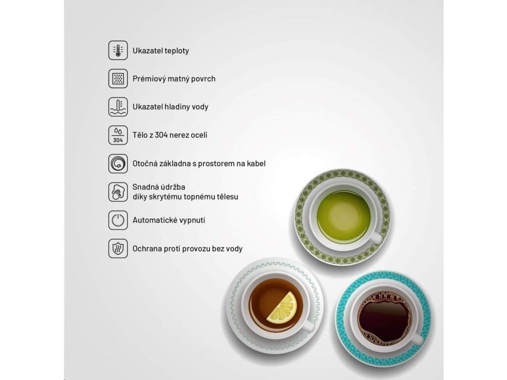 Objem 1,8 l, příkon 2200W, ukazatel teploty vody, materiál nerez, prémiový matný povrch, ochrana proti chodu naprázdno, ochrana proti přehřátí, otočná základna, podsvícený vypínač, úložný prostor pro kabel.