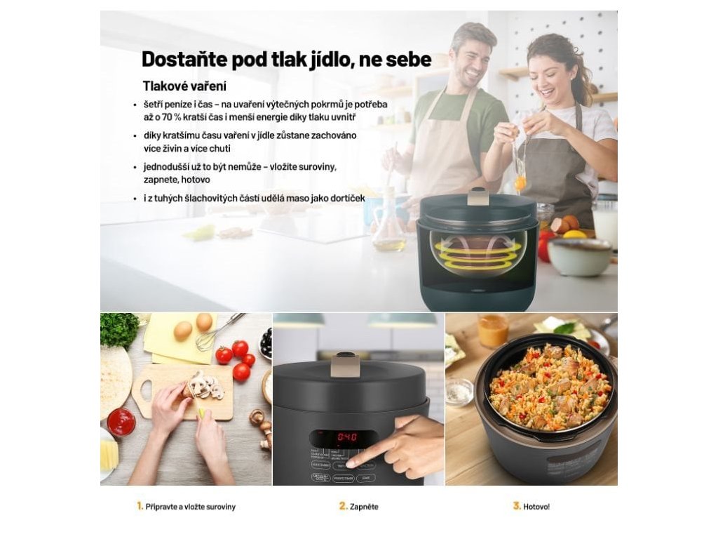 Kratší příprava prospívá také surovinám, které si uchovávají více živin. Stačí přitom jediné, vložit vše potřebné do hrnce, zavřít, zapnout a o vše ostatní se již přístroj postará sám.