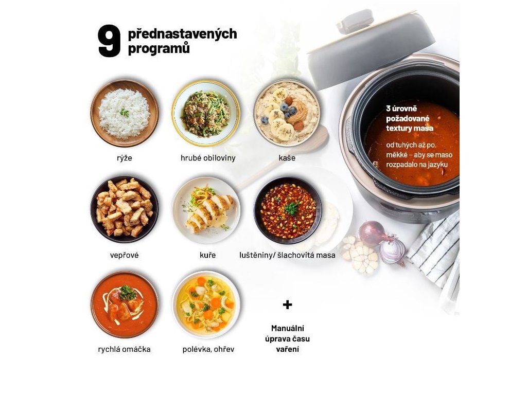 Přístroj disponuje 9 přednastavenými programy - rýže, hrubé obiloviny, porridge, vepřové, kuře, luštěniny/ šlachovitá masa, rychlá omáčka, polévka, ohřev.