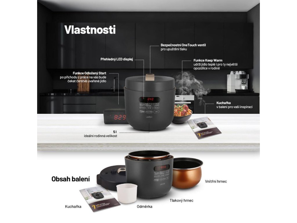 Čas přípravy ovlivníte i manuálně. 5l objem stačí pro celou rodinu, údržba je snadná, bezpečnost zajišťuje One Touch ventil pro upuštění tlaku. Jídlo udrží teplé funkce Keep Warm, lepší plánování umožní odložený start.