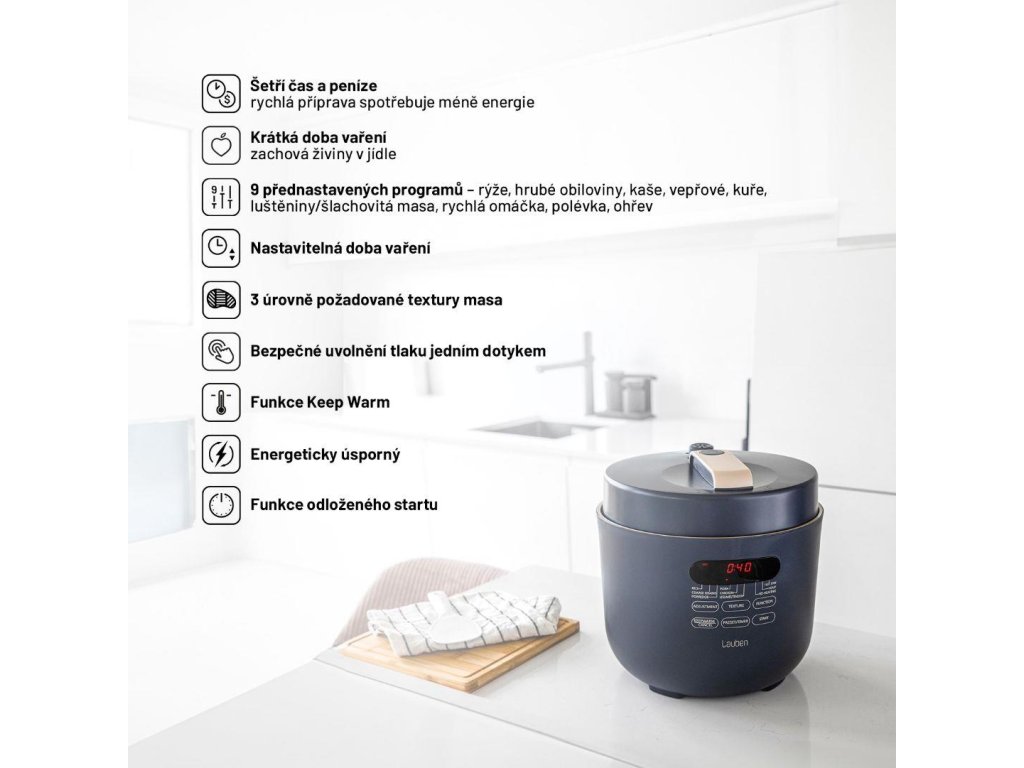 Tlakové hrnce bývaly vždy vítanými, avšak obávanými společníky v domácnosti. Energeticky úsporný víceúčelový elektrický tlakový hrnec Lauben Electric Pressure Cooker 5000AT má všechny výhody tzv. papiňáku a ještě víc, jen v moderním a bezpečném hávu.
