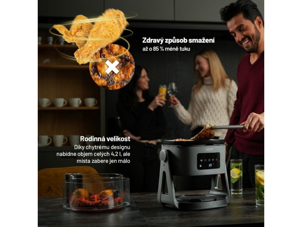Horkovzdušná fritéza s grilem díky vysokorychlostní 360° cirkulaci vzduchu ušetří čas strávený v kuchyni, energii i zdraví. Nastartuje vaši cestu lepšího životního stylu, neboť oblíbená smažená jídla připraví s využitím až o 80 % menšího množství tuku. Rovnoměrného propečení dosahují pokrmy pronikáním infračerveného světla. Ještě více možností přípravy jídel poskytuje unikátní technologie umožňující otáčení horní části o 180°, a to především ve spojení s grilovací a hlubokou pánví, jež jsou součástí balení.