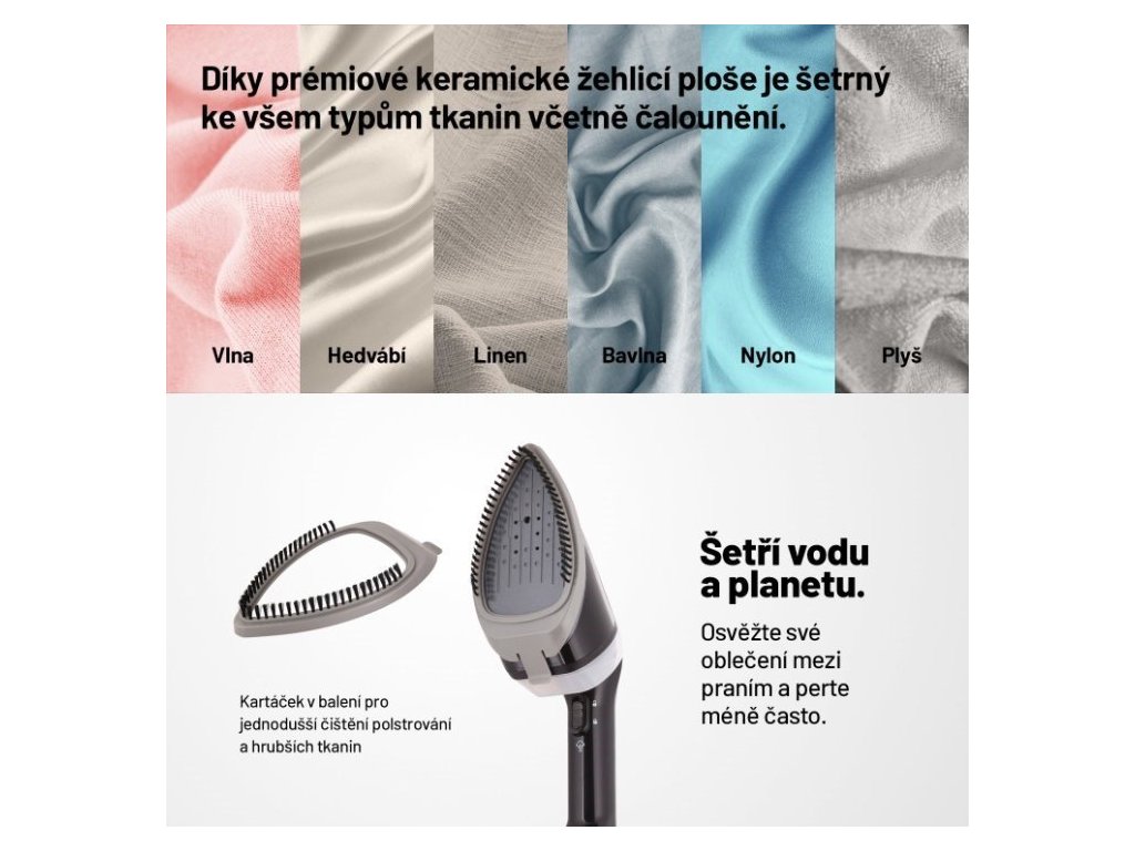Ve spojení s dezinfekcí povrchů horkou párou je napařovač vhodný také na závěsy či čalounění, pára zneškodní bakterie a zápach. K výhodám napařovače patří keramická žehlicí plocha šetrná k choulostivým tkaninám.