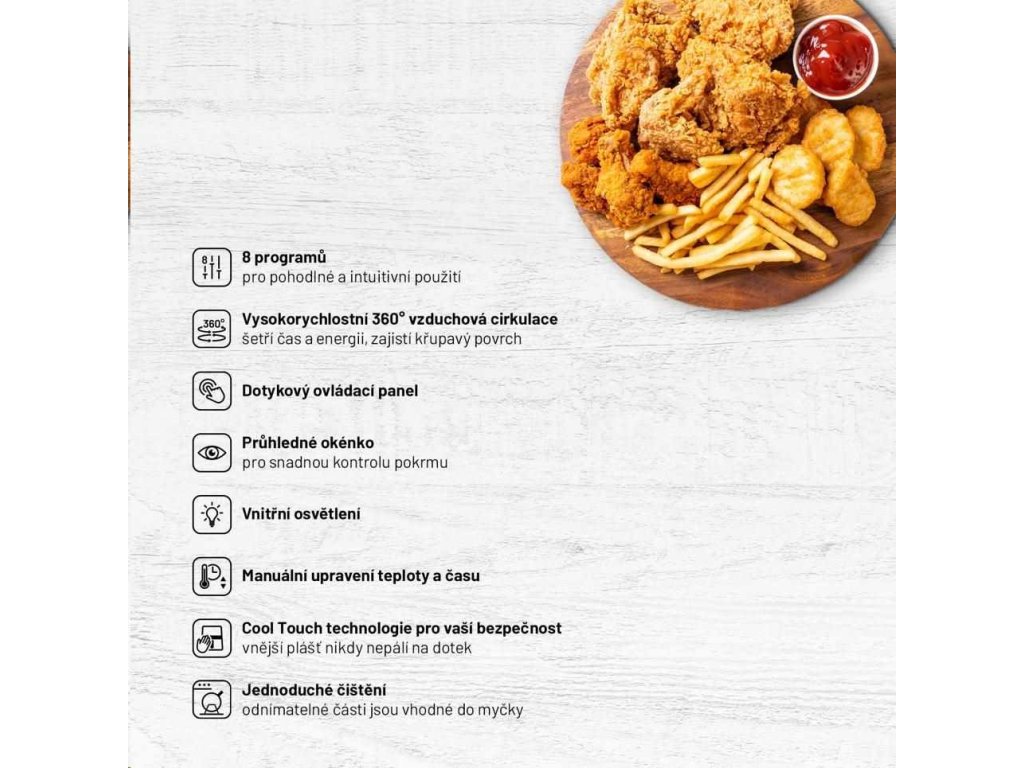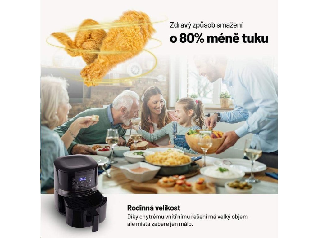 Horkovzdušná fritéza, objem nádoby 4l, příkon 1 600W, 8 programů vč. manuálního nastavení a předehřátí, digitální displej, vnitřní tác vhodný do myčky, 360° cirkulace horkého vzduchu, nastavitelná teplota: 120° - 200°, nastavení času 1 – 50 min