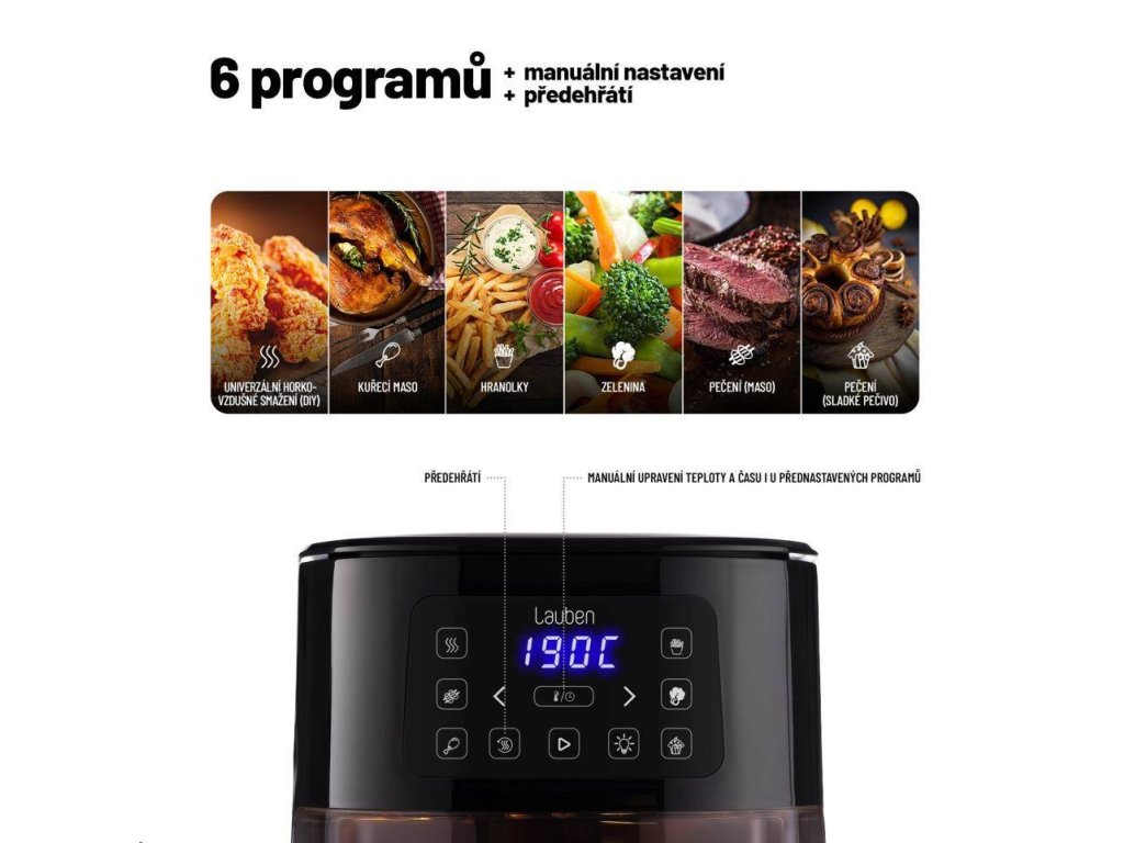 S Lauben Hot Air Fryer 4000BC máte na výběr z 6 přednastavených programů, které jsme připravili s ohledem na specifika jednotlivých surovin. Vybírat můžete z těchto režimů: Hranolky, Pečení – maso, Sladké pečení, Zelenina, Univerzální horkovzdušné pečení (DIY), Kuřecí maso. S pomocí dalších dvou funkcí Předehřátí a Manuální nastavení si potom poradíte s jakýmkoliv požadavkem vašich drahých. Pokud vám žádná z nabízených variant nebude vyhovovat, nevadí. Teplotu i čas přípravy si můžete jednoduše upravit sami pomocí tlačítek a displeje. Ať už se rozhodnete jakkoliv, výsledkem bude zdravé, dokonale propečené a křupavé jídlo.