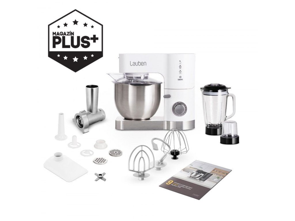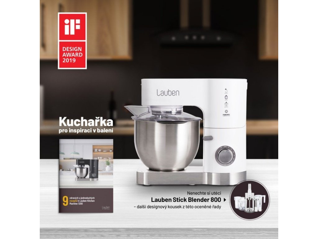 Lauben Kitchen Machine 1200WT je kuchyňský robot s bohatým příslušenstvím, díky kterému se za vás hravě postará o spoustu kuchyňských prací a zároveň vám ušetří místo v kuchyni. Ostudu vám v kuchyni neudělá ani vzhledem, což dokládá prestižní designové ocenění IF Design Award 2019. Míchání, šlehání, hnětení těsta i mletí masa, o to vše se spolehlivě postará spolehlivý měděný motor o výkonu 1200W a vysokozátěžové celokovové převody. Robot disponuje technologií EffectiMix® , která zajišťuje planetární mixovací pohyb a rovnoměrný výsledek. Díky systému SpeedPrecision® máte na výběr z 8 přesně kalibrovaných rychlostí a možnosti PULSE pro přesné výsledky. Hlavní mixovací nádoba je vyrobena z nerezové oceli a má kapacitu 5l. Robot jsme doplnili o mixovací sklenici z tvrzeného skla s víkem pro přidávání ingrediencí. Můžete ho tak využít k přípravě studených či vlažných polévek nebo čerstvých smoothies. Bezpečnost je vždy na prvním místě, proto je Lauben Kitchen Machine opatřen pojistkou, která ho spustí jen, je-li správně uzavřen, protiskluzovými nožkami a pojistkou proti přehřátí. Správné usazení mísy bude hračka díky barevnému indikátoru. Robot vás potěší i snadným ovládáním pomocí jediného tlačítka, nízkou hlučností a dvěma barevnými provedeními. Protože moc dobře víme, že není jednoduché každý den vymýšlet, čím nakrmíte rodinu či sebe, přidali jsme do balení kuchařku s recepty pro inspiraci.