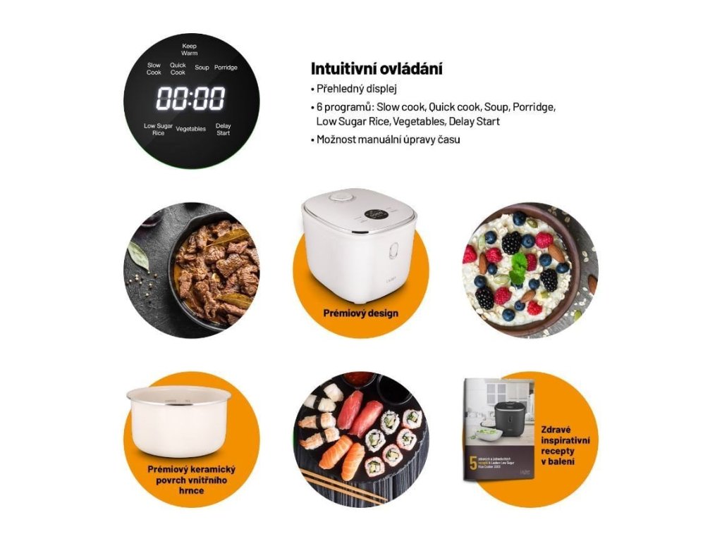 Rýžovar disponuje 6 přednastavenými funkcemi pro snazší přípravu jídel - Slow cook, Quick cook, Polévka, Kaše, Low Sugar rýže, Zelenina.
