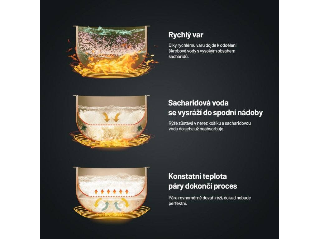 Díky této funkci připravíte rýži s až o 40 % nižším obsahem sacharidů, nadbytečné se oddělí od rýže a vysráží do vody ve spodní nádobě.