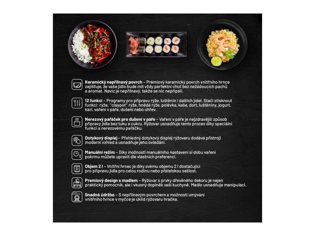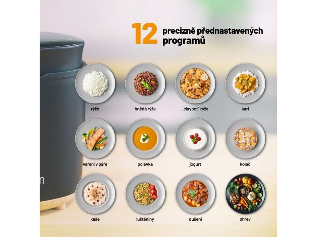Dopřejte si více času na jiné aktivity a vaření přenechte multifunkčnímu rýžovaru, jehož 12 přednastavených programů si poradí s přípravou nejrůznějších pokrmů. Programy jako rýže, "claypot" rýže, hnědá rýže, polévka, kaše, dort, luštěniny, jogurt, kari, vaření v páře, dušení či ohřev jsou zárukou snadného a rychlého vaření.