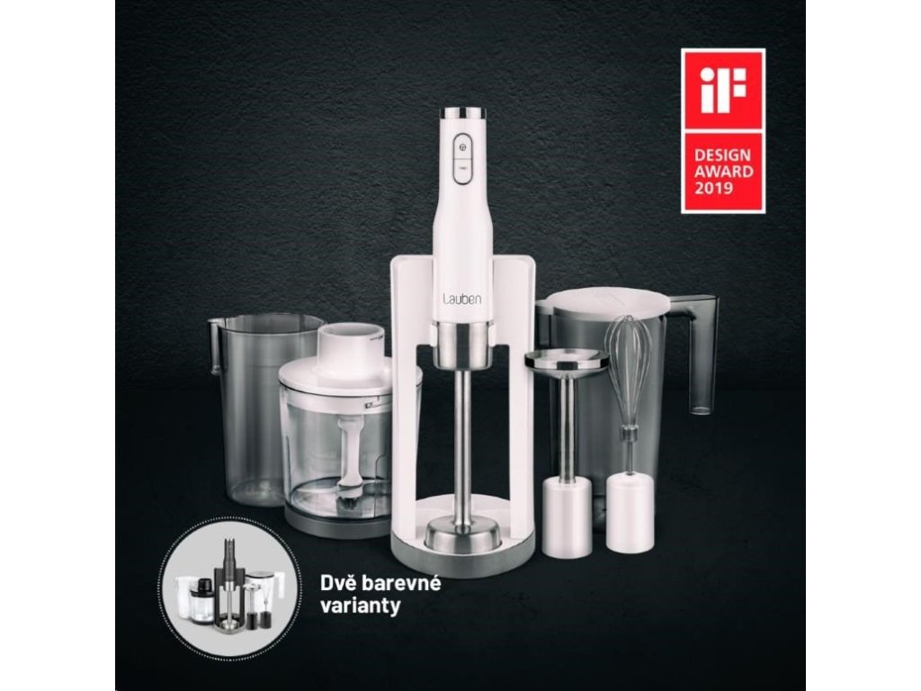 Lauben Stick Blender je příkladem důmyslné kombinace funkčního a stylového designu, za který mu právem náleží prestižní ocenění IF Design. Nejen, že dobře vypadá, ale díky ergonomickému tvaru a protiskluzové úpravě se s ním velmi snadno manipuluje a dobře se drží. Tělo mixéru je zároveň dostatečně robustní, takže nad ním máte absolutní kontrolu. Oceníte i praktický stojan, do kterého umístíte všechny nástavce. Mixér vám v kuchyni nebude zabírat tolik místa a vaše kuchyňské skříňky zůstanou uklizené. Na výběr máte ze dvou barevných variant.