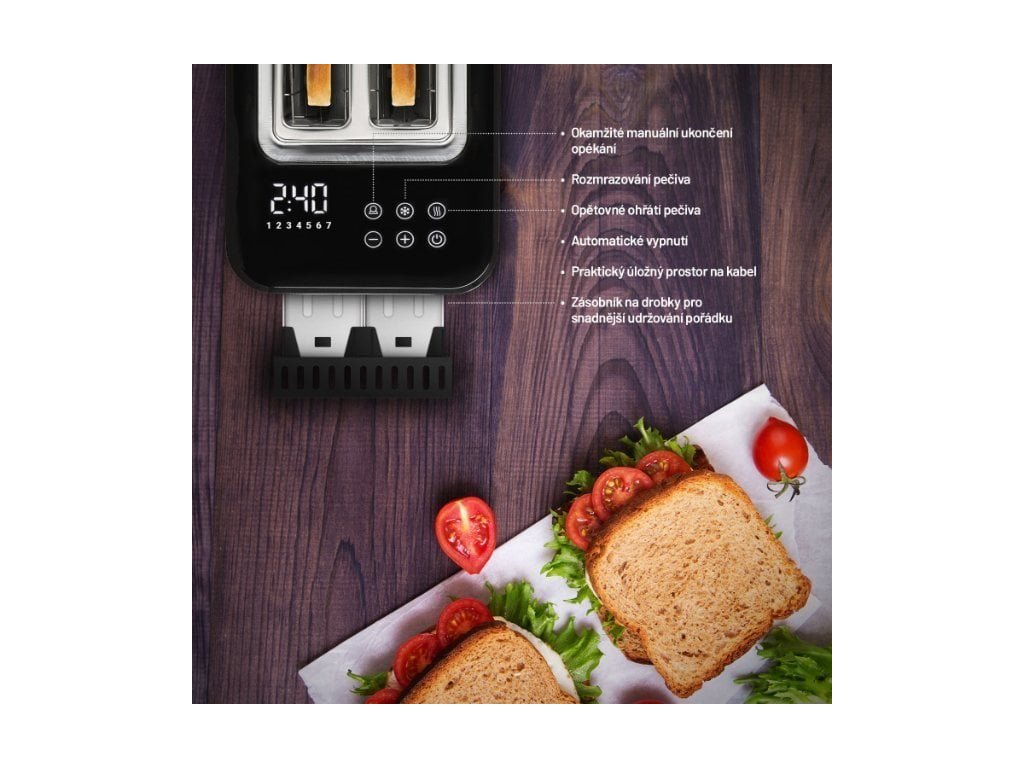 Topinkovač pro 2 ks pečiva, 7 stupňů ohřevu, uživatelská paměť, ohřívací mřížka na větší pečivo, vyjímatelná miska na drobky, funkce vycentrování pro rovnoměrné opečení, funkce rozmrazování, funkce opětovného ohřevu
