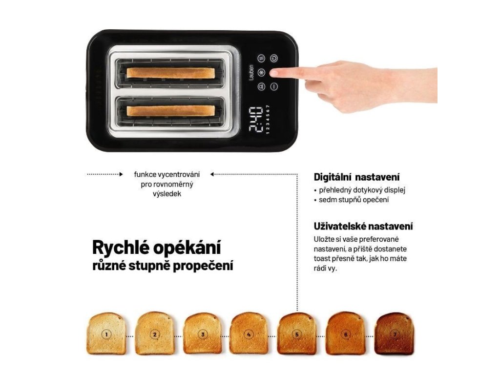 Křupavý toast k snídani namazaný máslem představuje pro mnohé dokonalý začátek dne. S Lauben Toaster 900BC získají vaše snídaně či svačiny zcela nový rozměr, díky digitálnímu nastavení na dotykovém displeji máte na výběr ze 7 stupňů intenzity opečení.