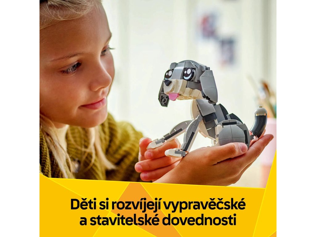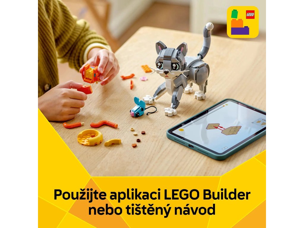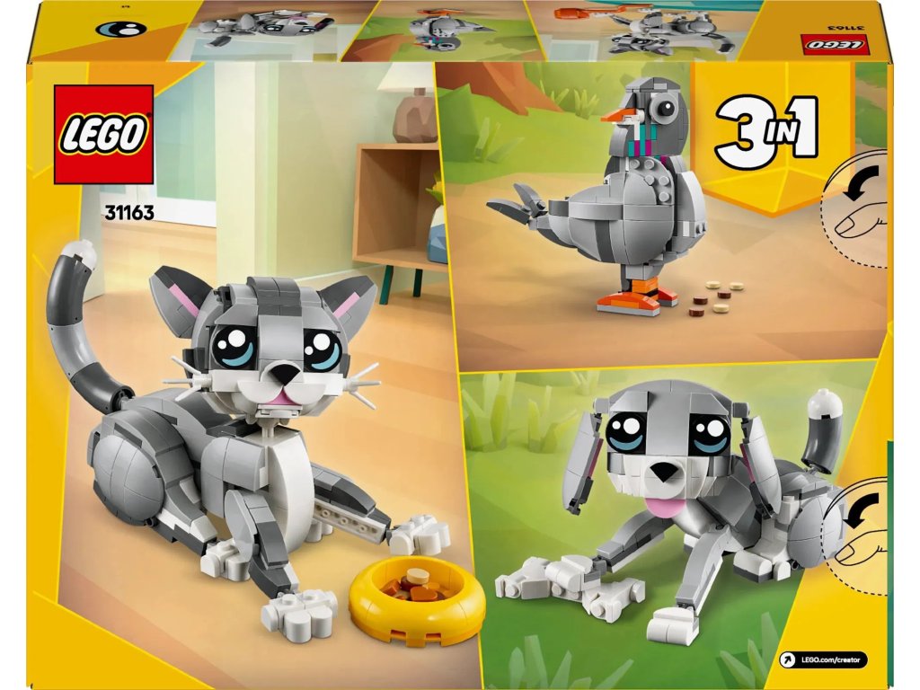 Potěšte milovníky domácích mazlíčků od 8 let rozkošnou stavebnicí LEGO® Creator 3 v 1 (31163) Hravá kočka. S touto stavebnicí domácích mazlíčků si postavíte roztomilou kočku s pohyblivou hlavou, ušima, ocasem a nohama a doplňky, včetně misky na krmení, myši a klubíčka, a děti se s ní můžou hrát na zábavné příběhy. Holky a kluci si s touto stavebnicí LEGO postaví hned 3 různé modely zvířátek ze stejných kostek: pohyblivou kočku, která může sedět, stát a skákat, pohyblivého roztomilého pejska s kostí a model holuba s drobky. Díky těmto 3 modelům se jedná o skvělý dárek LEGO, který si děti můžou vystavit a užít si s ním nápadité hraní. Stavebnice LEGO Creator 3 v 1 inspirují děti ke kreativnímu stavění – v každé krabici najdou dílky k sestavení a přestavování 3 různých modelů. Se stavebnicemi 3 v 1 si postaví modely inspirované jejich zájmy, včetně superrychlých vozidel, úžasných zvířat a propracovaných domů. Upozorňujeme, že modely nelze sestavit současně.