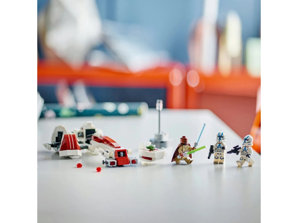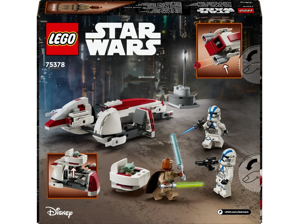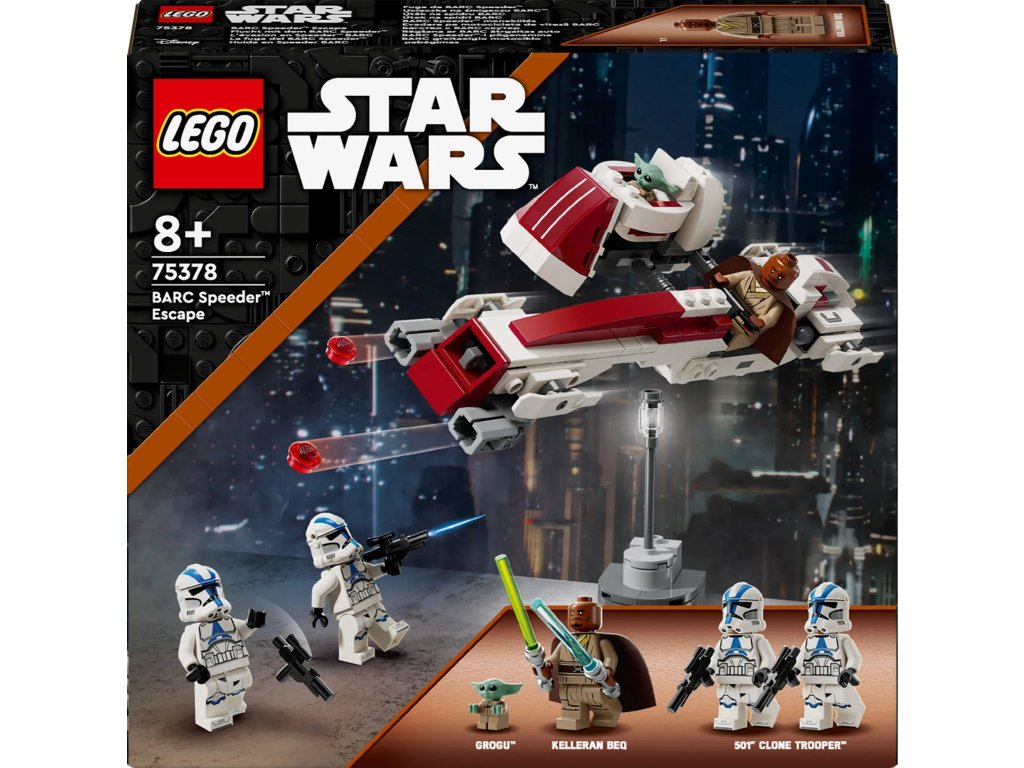 Připomeňte si scénu Útěku na spídru BARC z 3. řady seriálu Star Wars: The Mandalorian s touto jedinečnou stavebnicí LEGO® Star Wars™ (75378). Model představuje skvělý dárek pro děti, fanoušky a sběratele Star Wars od 8 let a najdete v něm spídrovou motorku s postranním vozíkem z kostek LEGO. Součástí spídru je kokpit pro minifigurku a 2 vystřelovače a do odnímatelného postranního vozíku lze připojit vznášející se kočárek Grogua. Ve stavebnici také najdete malý model scenérie a 3 minifigurky LEGO: Kellerana Beqa s modrým a zeleným světelným mečem a 2 klonované vojáky z 501. legie s blastery, a navíc figurku LEGO Grogua (kterého fanoušci někdy označují jako malého Yodu), se kterými se můžete těšit na kreativní hru plnou akce.