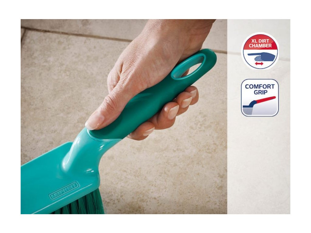 Extra široký smetáček, lopatka s gumovým zakončením pro snadné nametení nečistot, speciální tvar lopatky umožňuje snadnou manipulaci s nameteným prachem a nečistotou, sestřihané zjemněné štětiny zametou i nejemnější částice prachu, ergonomická rukojeť s protiskluzovou úpravou.