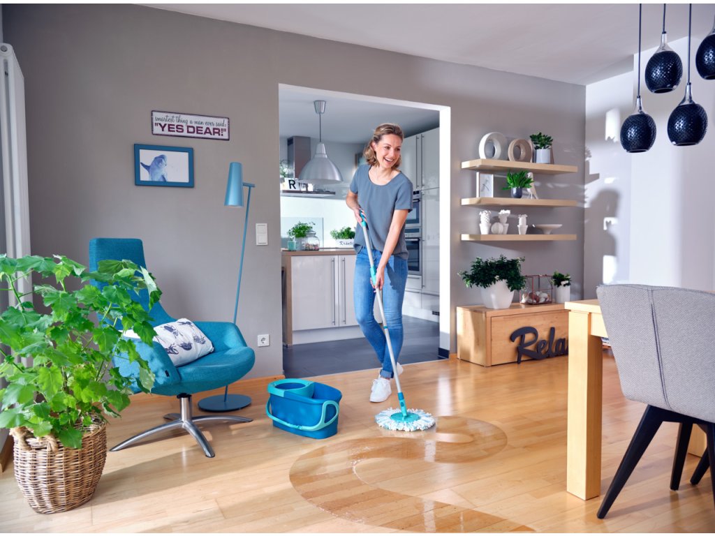Rotační úklidový set Clean Twist Disc Mop Ergo určený pro mytí podlah bez kontaktu rukou a špinavé vody značky Leifheit.