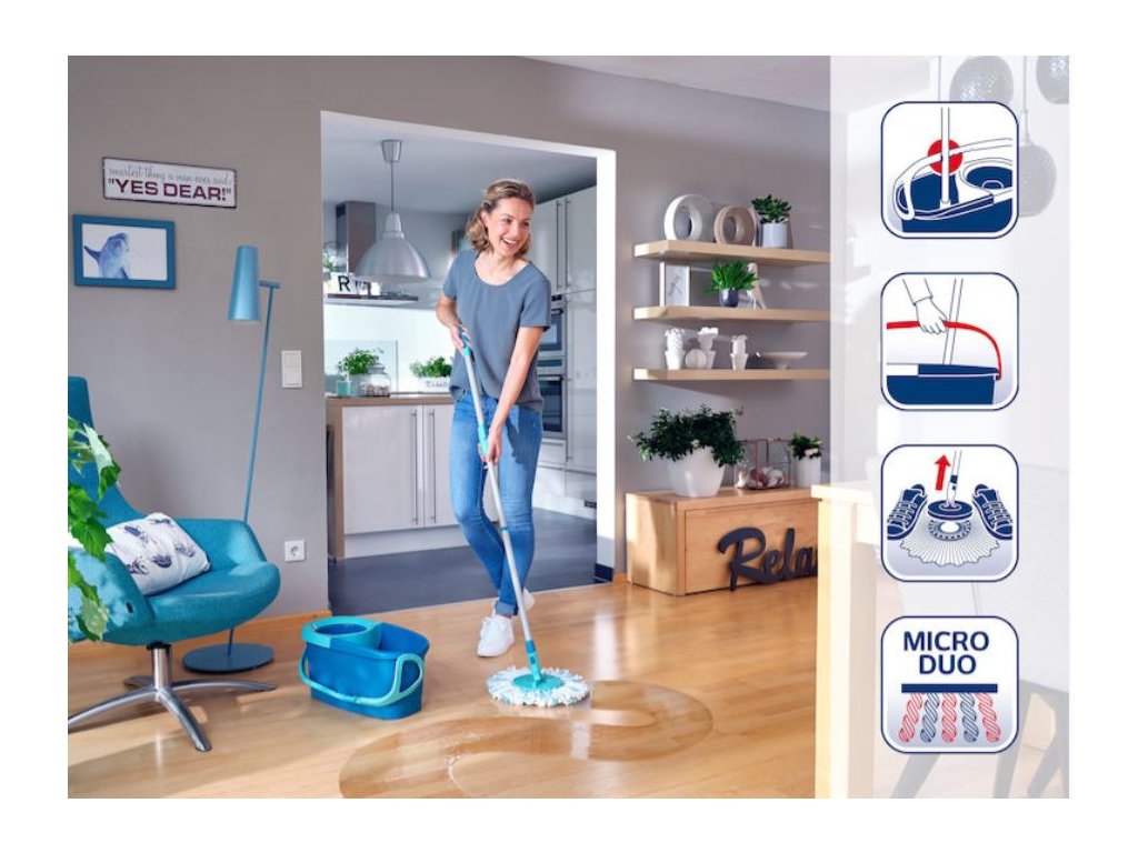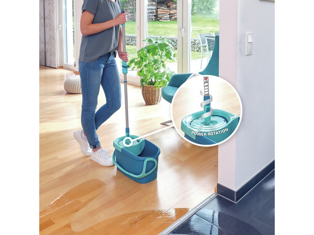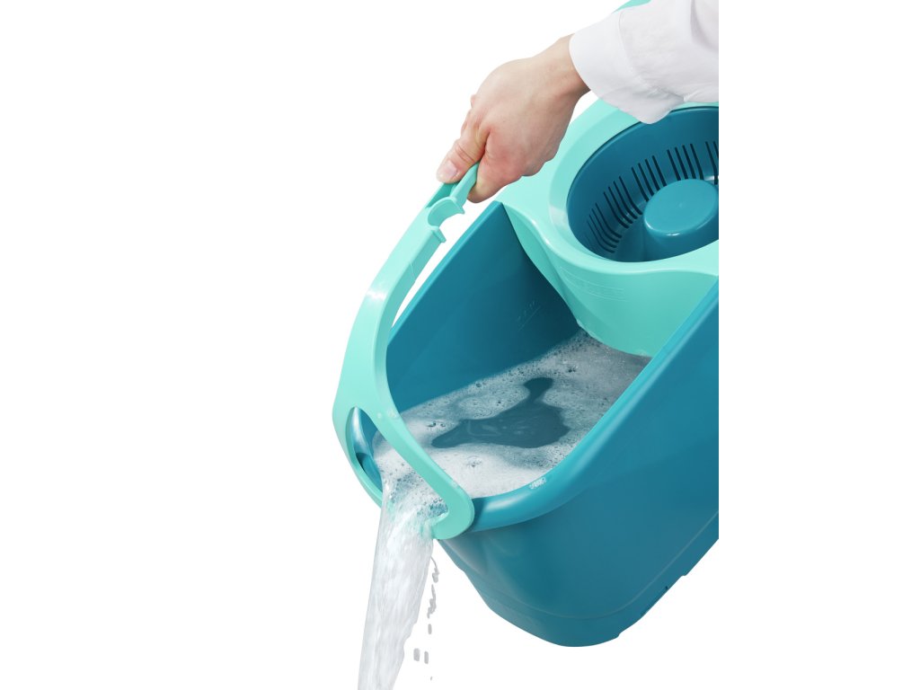Do vědra napustíte horkou vodu s čistícím prostředkem. Třásně mopu namočíte. Poté mop přesunete do rotační komory, do které hlavice mopu hezky zapadne. Odjistíte tyrkysovou páčku v násadě mopu a opakovanými pohyby násady dolů a nahoru rotační komoru roztočíte.