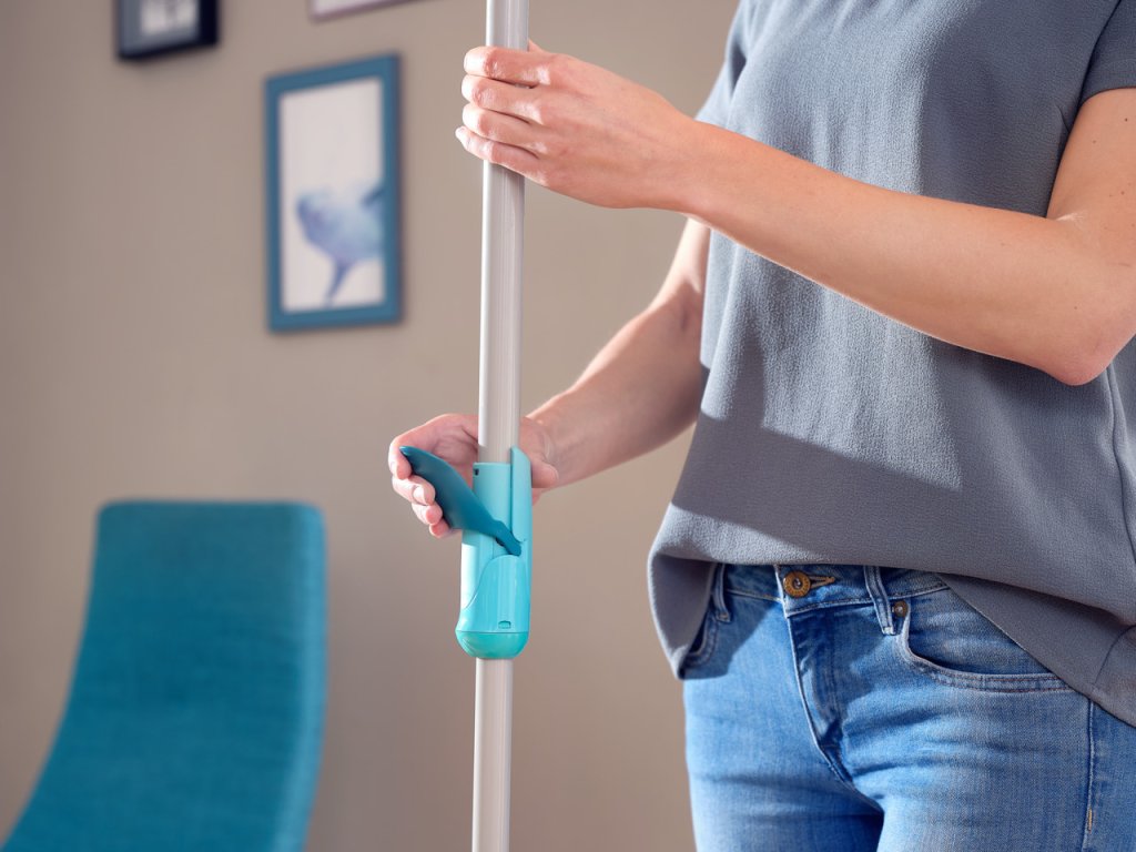 Zatlačením násady dolů proti rotační komoře pak ždímání snadno zastavíte. Poté tyrkysovou páčku opět zajistíte a mop je připraven k úklidu. Úroveň vyždímání volíte podle typu stírané podlahy. Čím déle komora rotuje, tím jsou třásně sušší.