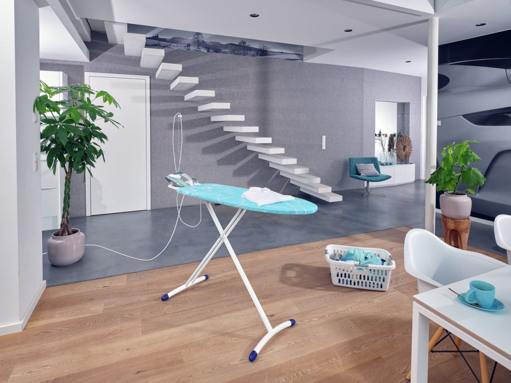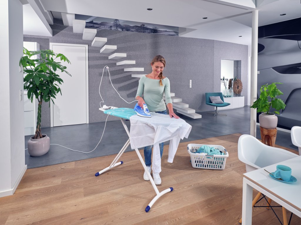 Žehlicí prkno je vyrobené z ultralehkých materiálů, má plynule nastavitelnou výšku, extra stabilní rám, pevnou odkládací plochu pro žehličku, speciální vodící anténu na elektrický kabel a integrovanou zásuvku. Práce u takového prkna je snazší, příjemnější a bez zbytečné bolesti v zádech.