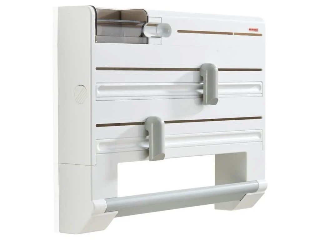Praktický pomocník pro uspořádání kuchyňských fólií a utěrek vybavený navíc integrovaným dávkovačem na samolepicí pásku, s extra prostorem na malé drobnosti a extra prostorem na sáčky do mrazáku.