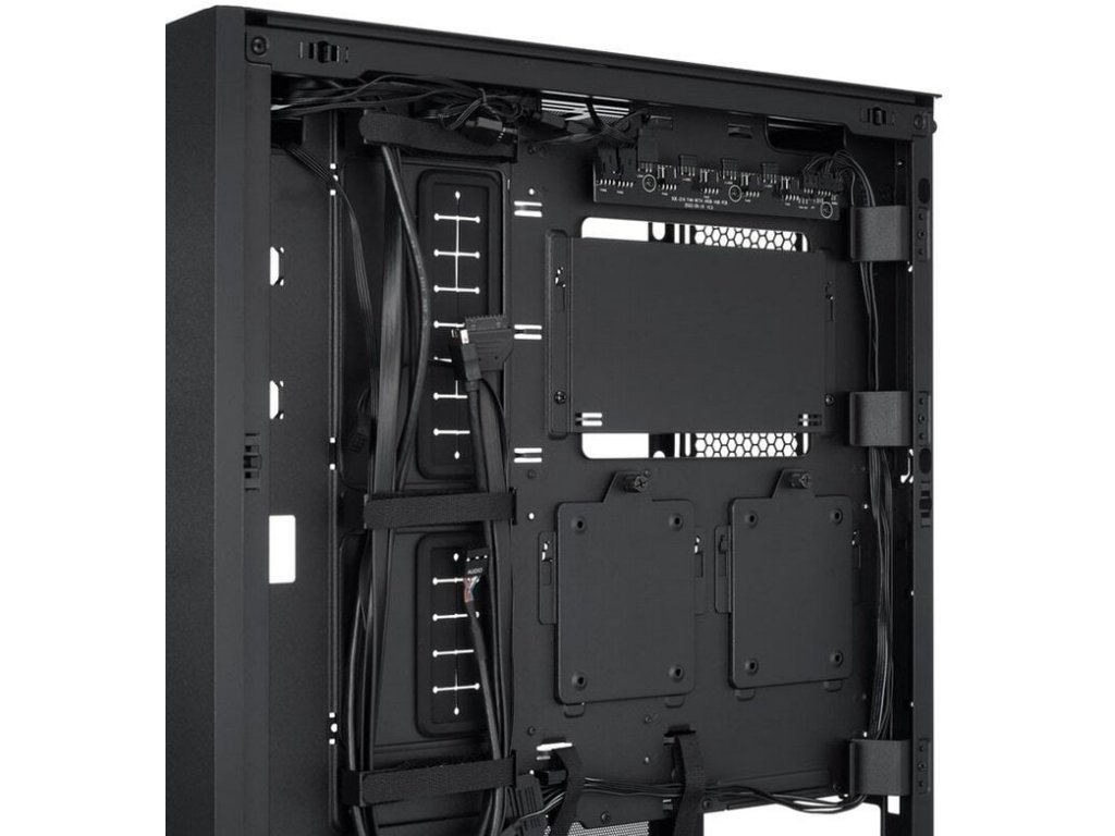 Kromě toho společnost Lian Li usnadnila také správu kabelů ventilátorů. Pro přední ventilátory jsou k dispozici standardní kanály, ale podobné možnosti směrování jsou i v horní části. Ty umožňují snadný přístup k zadní komoře, aniž byste museli vstupovat do hlavní komory.