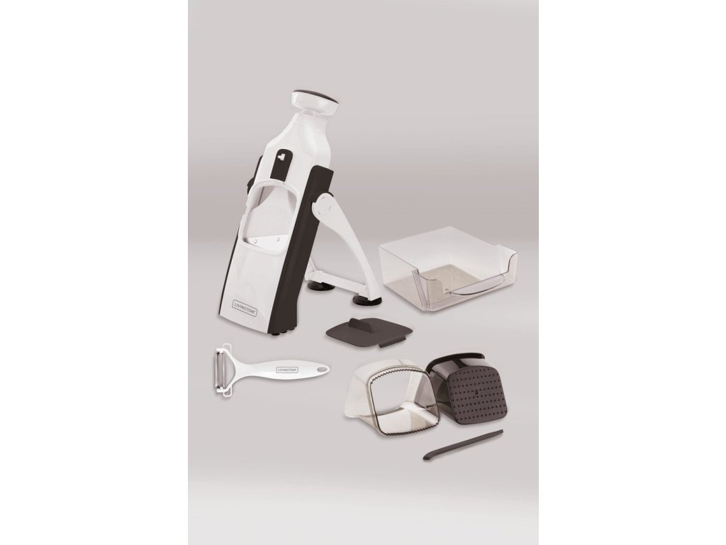 Včetně škrabky, krytu nože, chrániče prstů, řezného nástavce, sběrné nádoby a pomůcky na čištění