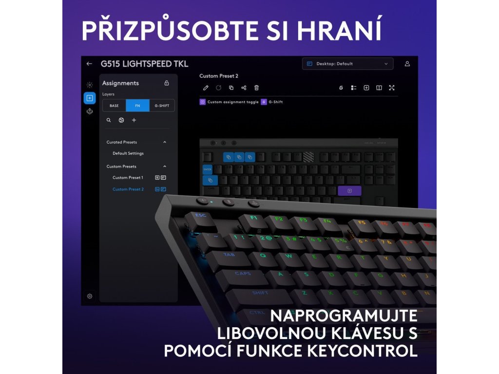 Ultratenký design se snoubí s vysoce výkonným technickým řešením v zařízení Logitech G515 LIGHTSPEED TKL. Přizpůsobte si svůj způsob hry díky připojení pomocí tří režimů a funkci KEYCONTROL.