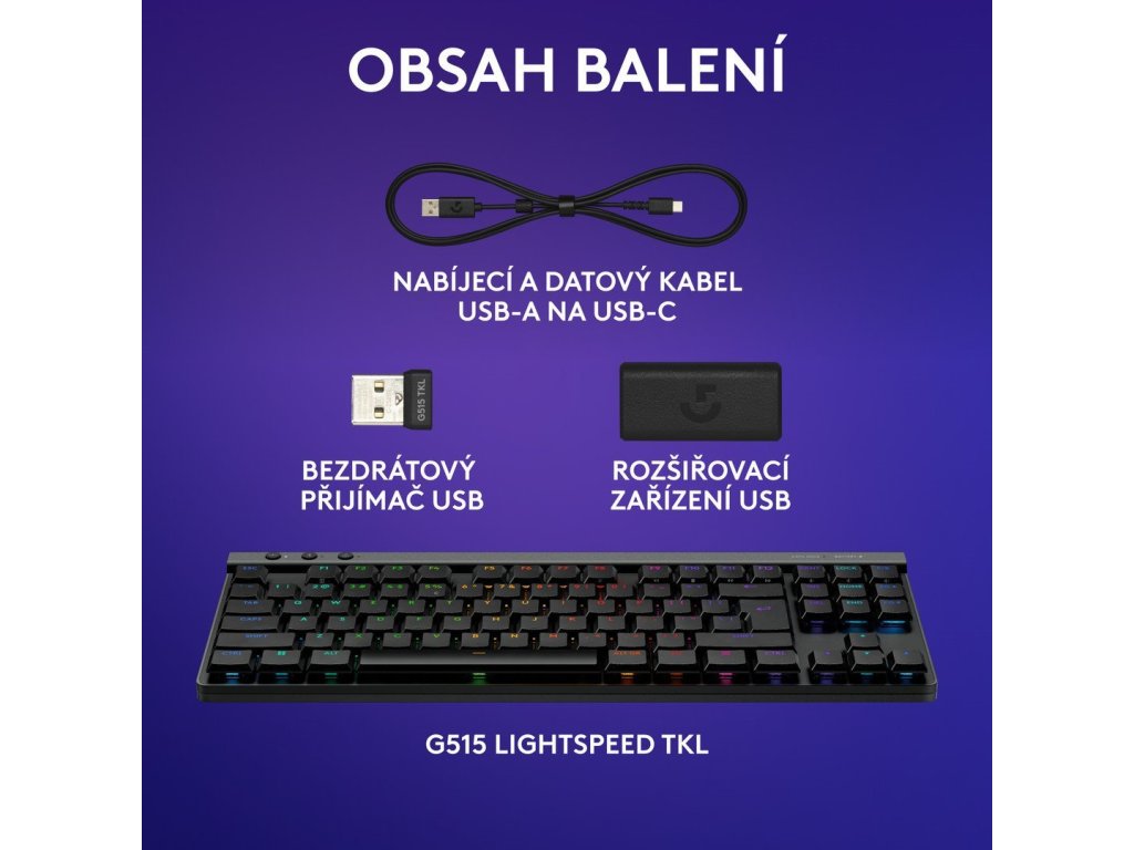Mechanická herní klávesnice: Klávesnice Logitech G515 LIGHTSPEED TKL nabízí štíhlý profil a provedení Tenkeyless bez numeriky s třírežimovým připojením prostřednictvím bezdrátové technologie LIGHTSPEED, Bluetooth nebo kabelového přenosu dat. Hnědé hmatové spínače GL se zřetelnou zpětnou odezvou: Nízkoprofilové mechanické spínače GL na této