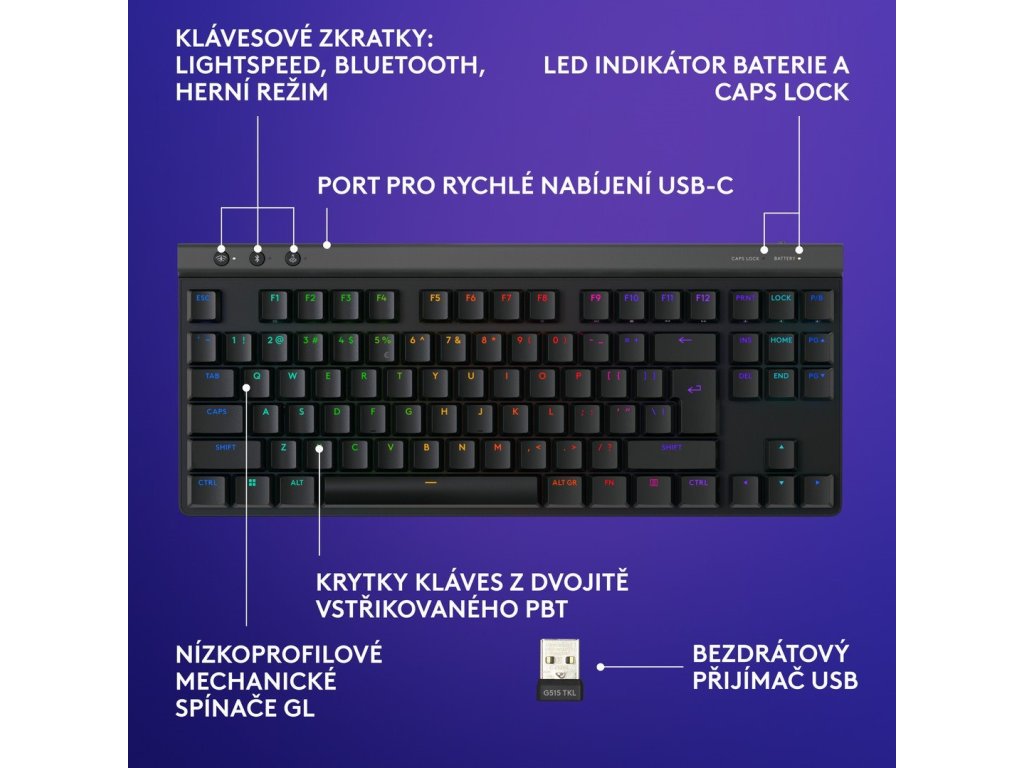 Mechanická herní klávesnice: Klávesnice Logitech G515 TKL nabízí štíhlý profil a provedení Tenkeyless bez numeriky,kabelový přenos dat. Hnědé hmatové spínače GL se zřetelnou zpětnou odezvou: Nízkoprofilové mechanické spínače GL na této