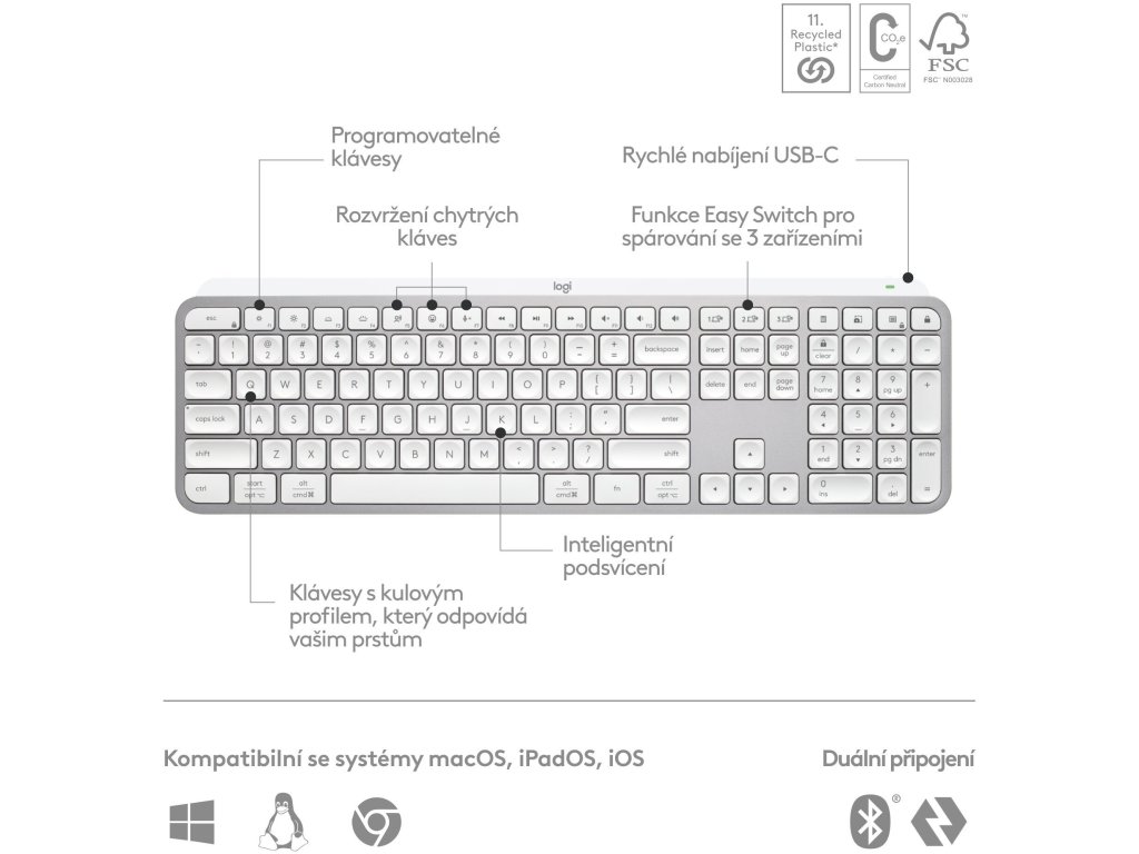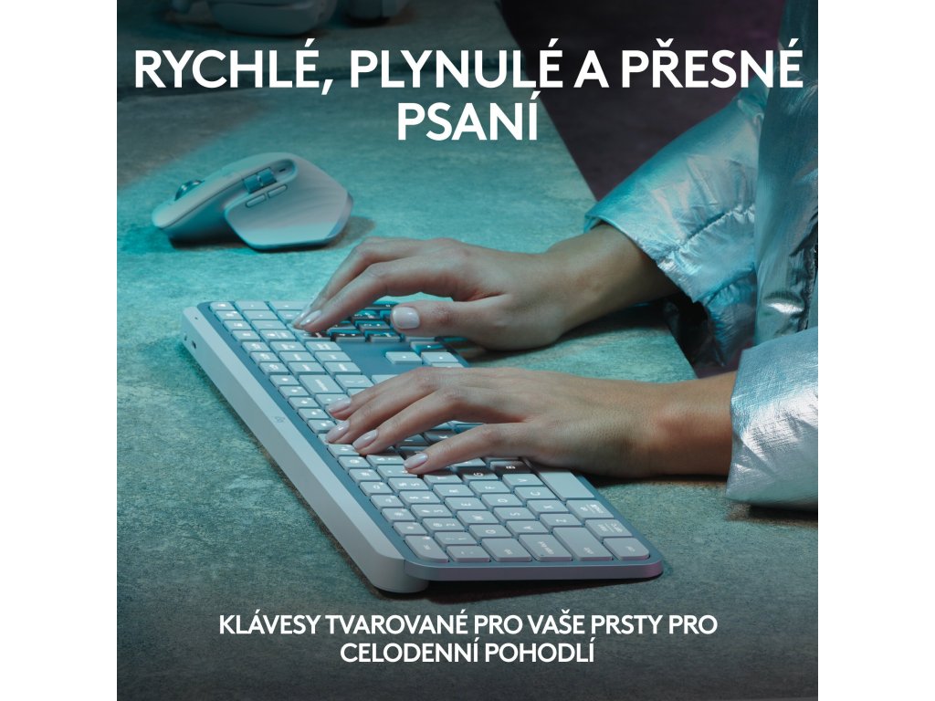 Zdokonalená bezdrátová podsvícená klávesnice MX Keys S nabízí rychlé, plynulé a pohodlné psaní díky nízkoprofilovým klávesám Perfect Stroke, které jsou vytvarovány přesně pro lidské prsty. Tato komfortní klávesnice je vybavena chytrým osvětlením, které rozpozná, že se ke klávesnici přibližují ruce, a automaticky přizpůsobí svůj jas v závislosti na světelných podmínkách v místnosti, což lze nyní individuálně nastavit v aplikaci Logi Options+. Klávesnice je k dispozici v grafitové nebo světle šedé barvě a má vylepšené rozložení kláves se třemi novými klávesami k maximální produktivitě a spolupráci: převod řeči na text, vypnutí/zapnutí mikrofonu a psaní emoji.