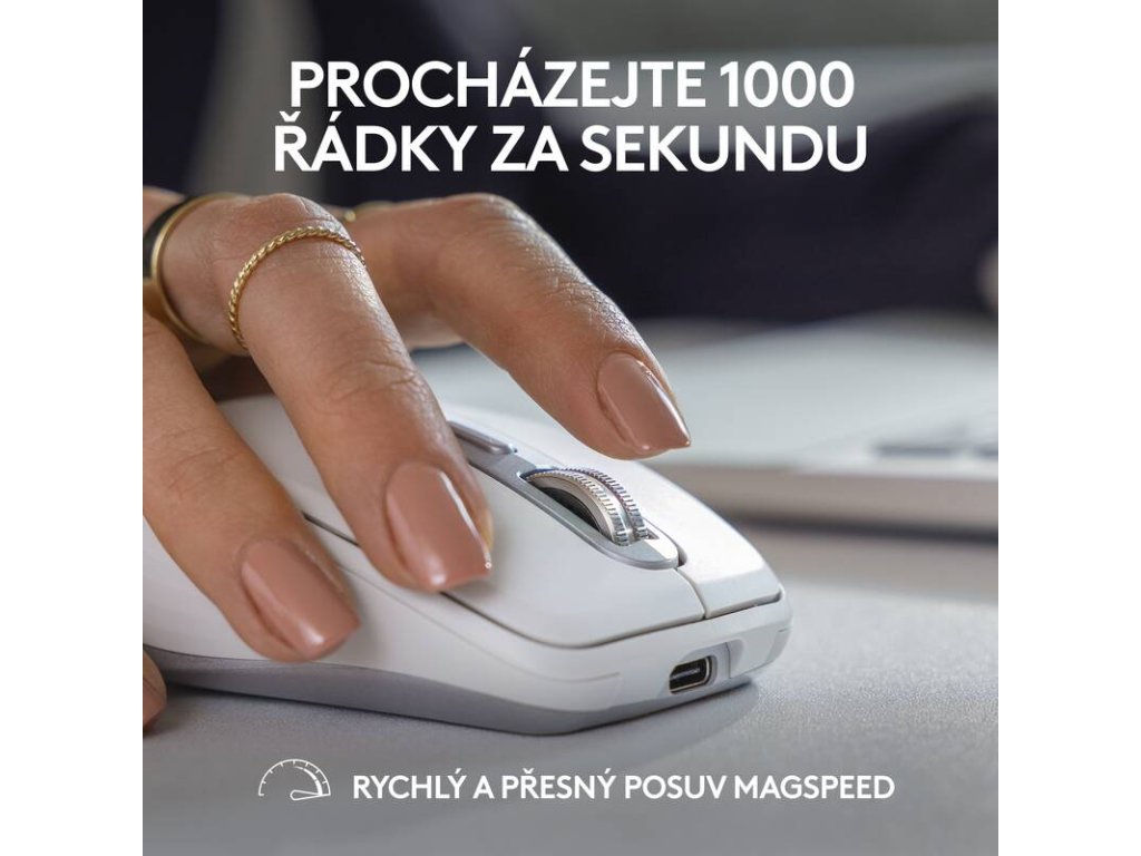 Pomocí rolovacího kolečka Magspeed. O 90 % vyšší rychlost a o 87 % yšší přesnost díky 2 režimům: po krocích a ultrarychlý posuv. (ve srovnání s běžnou myší Logitech)