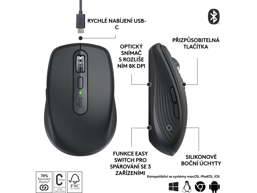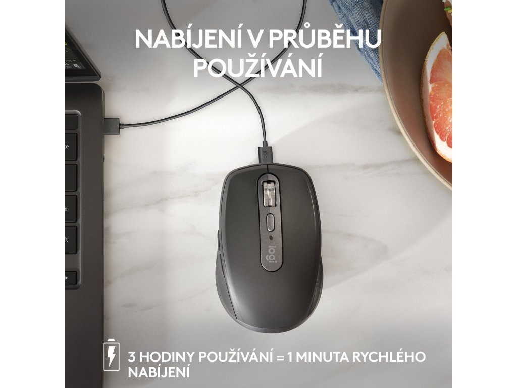 Pracujte na libovolném povrchu, dokonce i na skle, s myší MX Anywhere 3S – nyní se snímačem s rozlišením 8K DPI, takže jemnými pohyby pokryjete více prostoru.