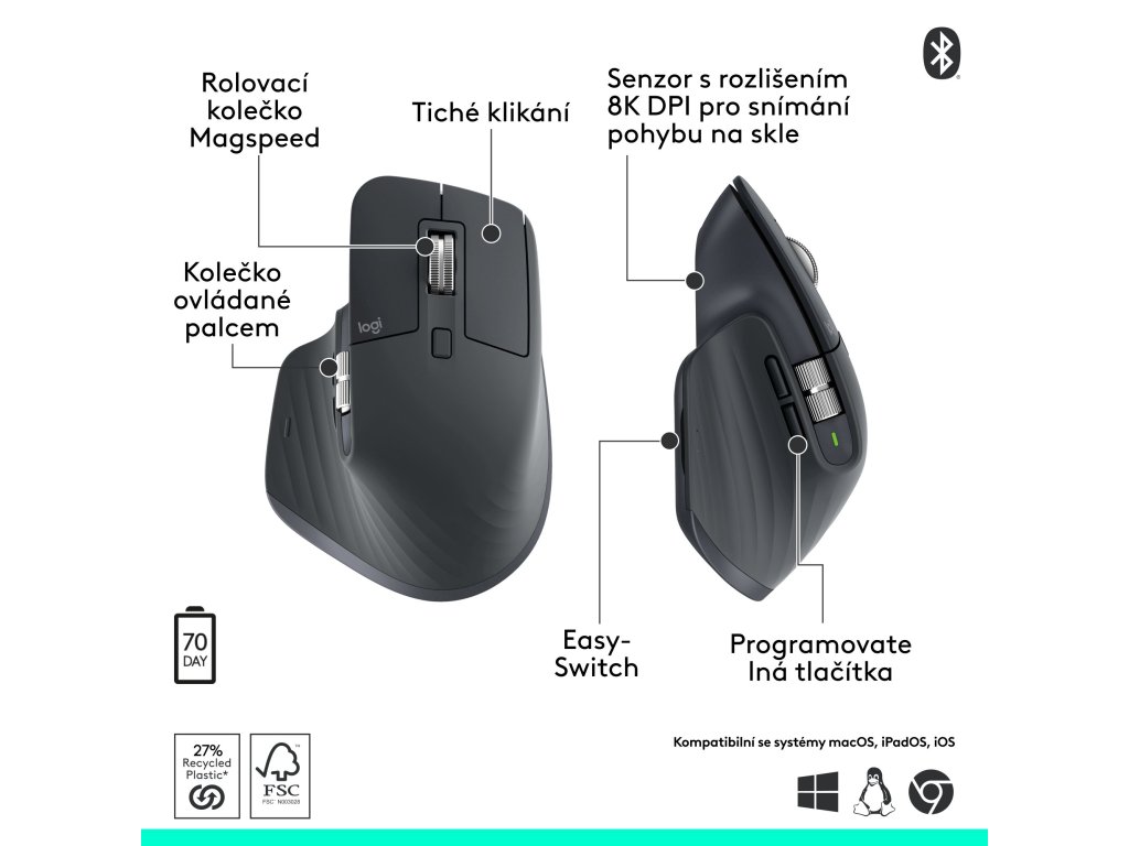 Logitech MX Master 3S BT Graphite, bezdrátová myš, Bluetooth - šedá