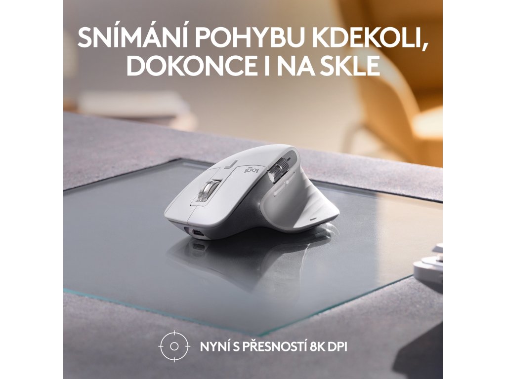 Pracujte na monitorech s velkým rozlišením s optickým snímačem s rozlišením 8 000 DPI s přesností na pixely, který sleduje prakticky kdekoli – dokonce i na skle (minimální tloušťka skla 4 mm). Upravte svou citlivost sledování v Logi Options+4 a nastavte si ji jako preferenční.