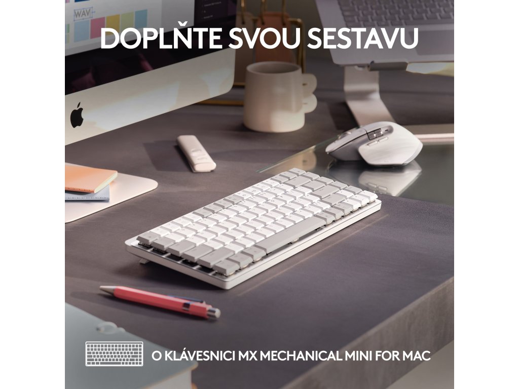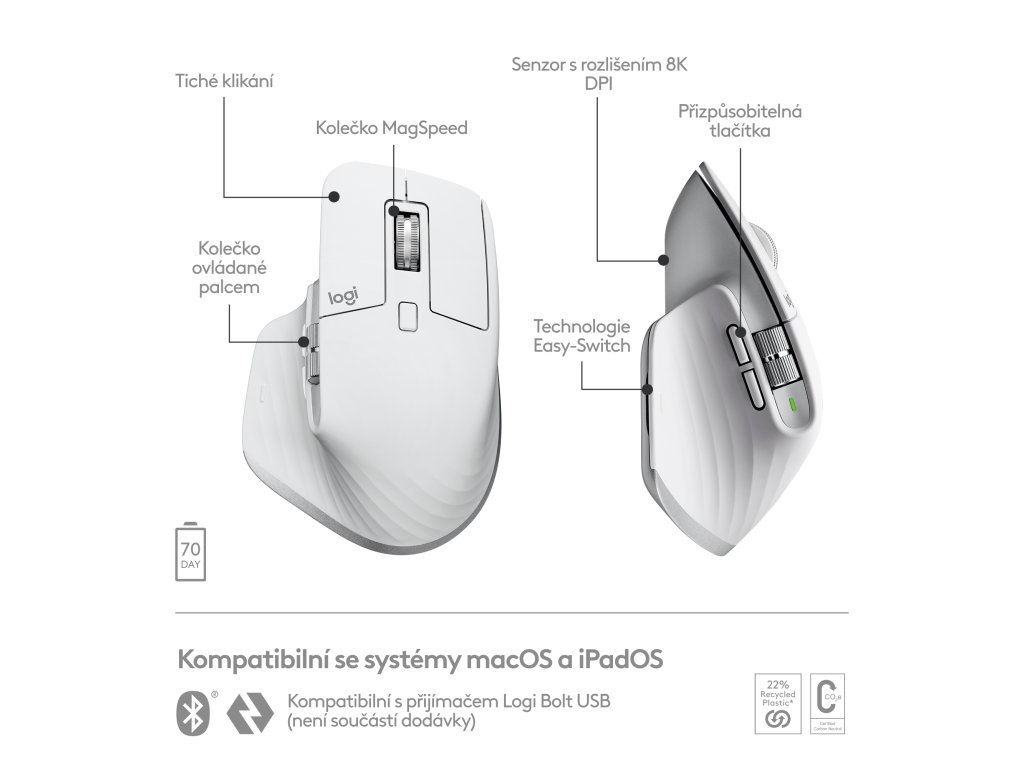 Seznamte se s MX Master 3S for Mac – ikonickou inovovanou myší. Kompatibilní s macOS, iPadOS a budou bez problémů integrovány do ekosystému Apple kvůli výkonu, s barvami inspirovanými Mac, tichými kliknutím a 8K DPI senzor pro sledování na skle.