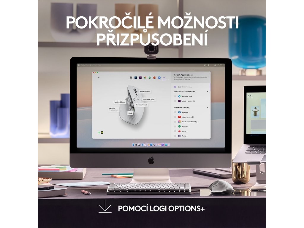 Myš MX Master 3S fo Mac je plně přizpůsobitelná pro prakticky jakékoli použití. Budete moci pracovat rychleji díky nadefinovaným možnostem přizpůsobení pro vaše oblíbené aplikace, např. Adobe Photoshop®, Adobe Premiere Pro, Final Cut Pro, Google Chrome™, Safari, Zoom® a Microsoft Teams®, Word®, Excel®, PowerPoint® a Edge.