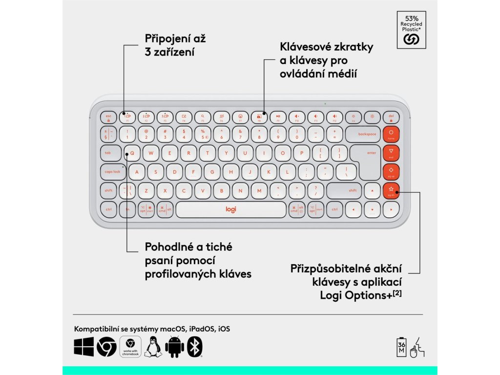 Oživte svůj stůl pomocí bezdrátové klávesnice POP Icon Keys, kompaktní klávesnice s výraznou estetikou, pohodlným psaním a přizpůsobitelnými akčními klávesami. Udělejte si pohodlí s tvarovanými, nízkoprofilovými klávesami pro pohodlné a tiché psaní.