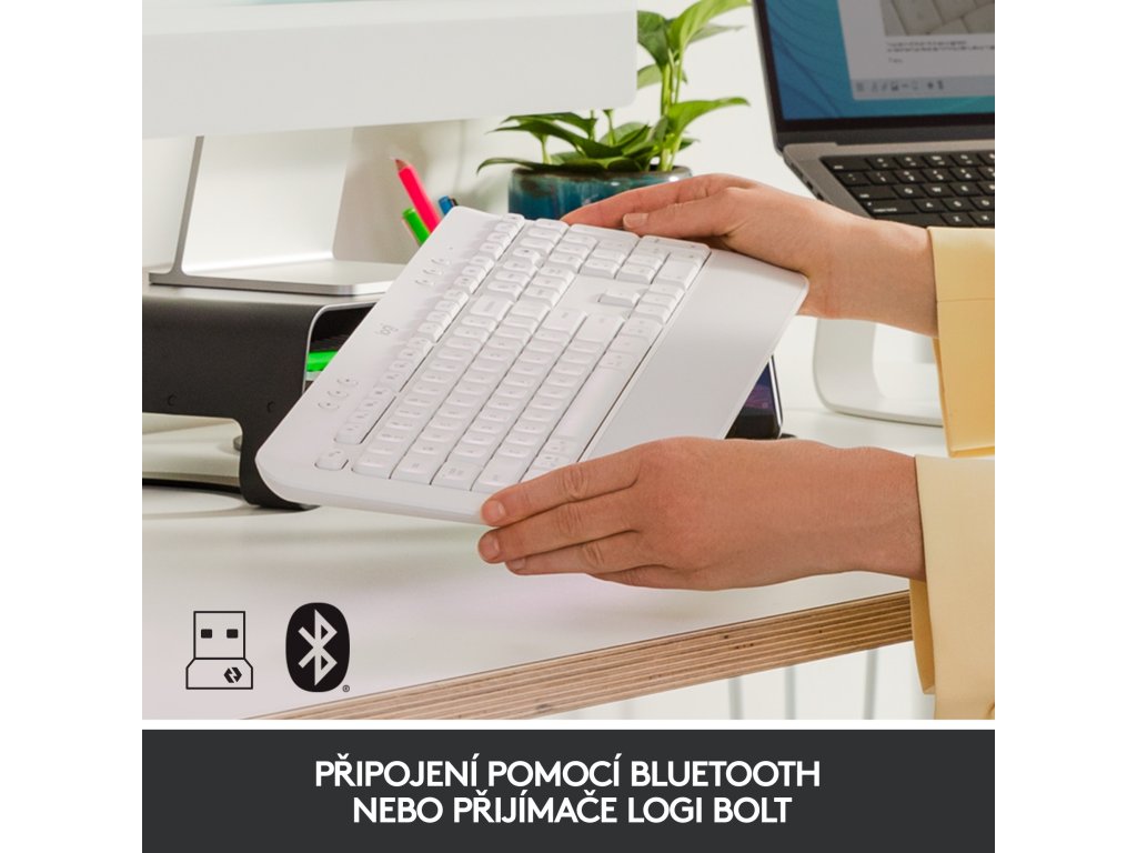 Připojení k zařízením je snadné díky bezdrátovému připojení prostřednictvím technologie Bluetooth Low Energy nebo přiloženého přijímače Logi Bolt USB. Získejte spolehlivé bezdrátové připojení na vzdálenost až 10 metrů, které vám umožní zůstat flexibilní v místě, kde pracujete, a přitom zajistit pořádek na stole a bez kabelů.