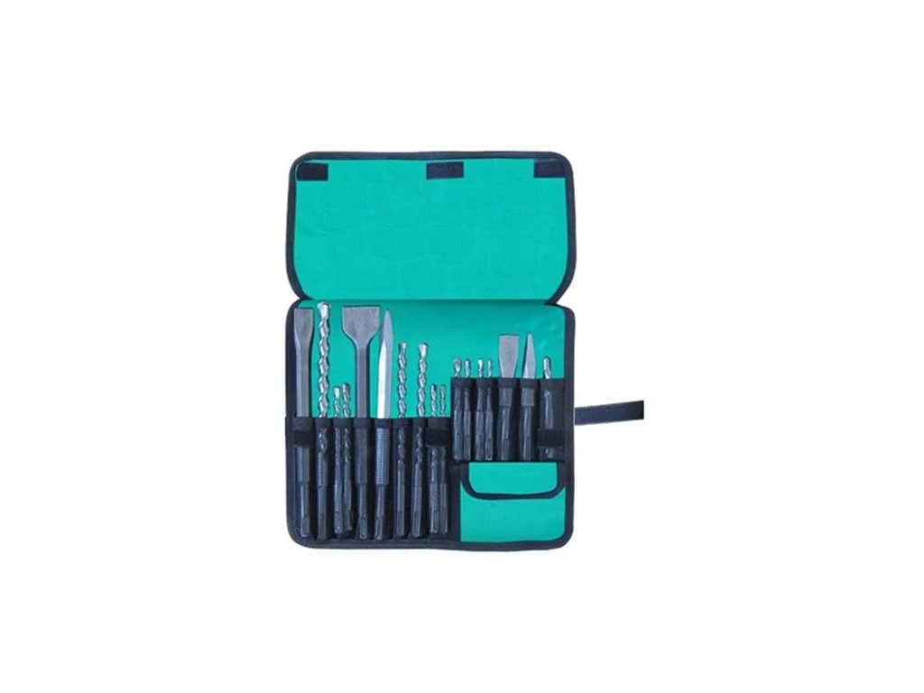 Sada vrtáků a sekáčů 17 ks SDS - plus v látkovém pouzdru (vrtáky: 5;5,5;6;8;10 x 50 x 110 mm; 6;7;8;10 x 100 x 160 mm; 8;10 x 150 x 210 mm; 14x 200 x 260; plochý sekáč 250 x 40; plochý sekáč 140 x 20; plochý sekáč 250 x 20; špičák 140 mm; špičák 250 mm)