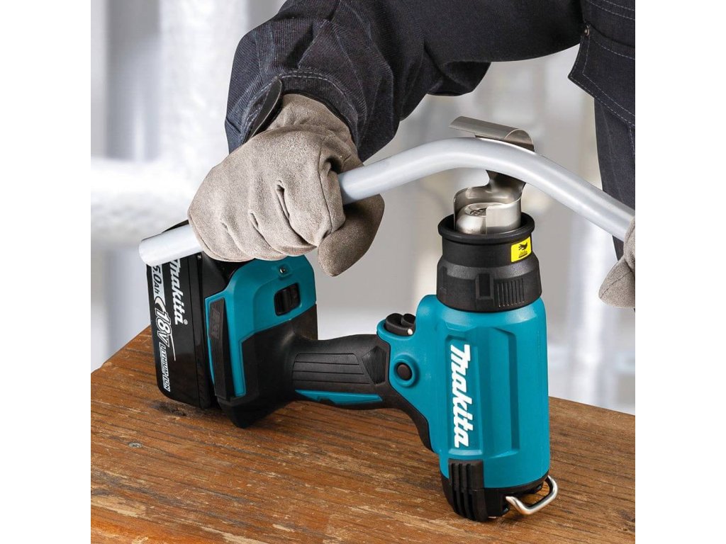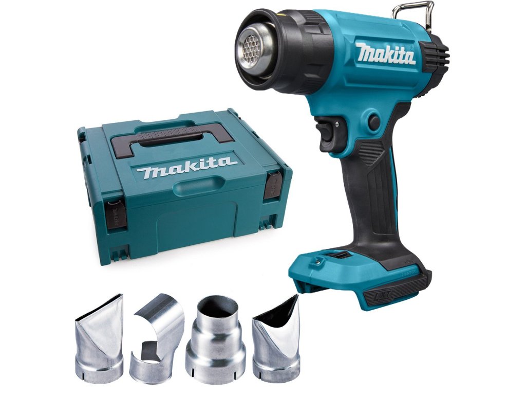 Aku horkovzdušná pistole. Napětí 18 V, teplota vzduchu 150 - 550 °C, objem vzduchu (režim 1/2)120 / 200 litrů/min, maximální výkon 10 w, hmotnost 1,0 - 1,4 kg, bez AKU, dodáváno s pouzdrem MAKPAC.