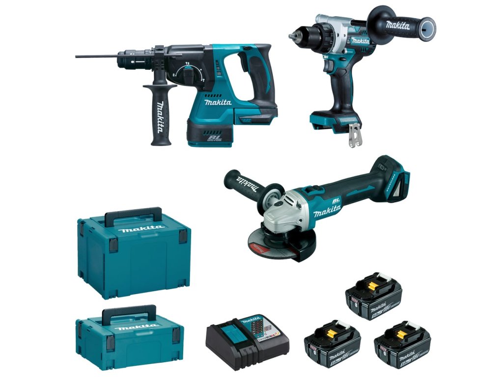 Dodávané příslušenství : rychlonabíječka DC18RC, 3 x akumulátor BL1850B, 2 x Makpac