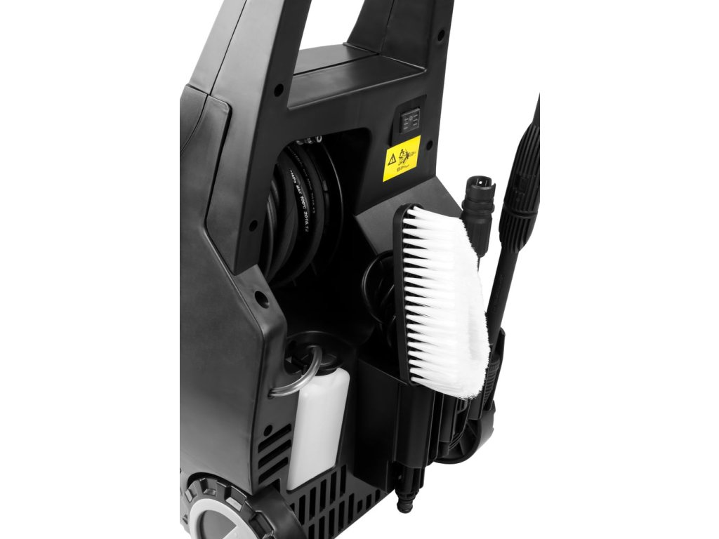 Vysokotlaká myčka 110bar,1700W. Robustní elektromotor s vyměnitelnými uhlíky. Nové odolné čerpadlo. Integrované držáky příslušenství. Pogumovaná kola. TOTAL STOP SYSTEM.