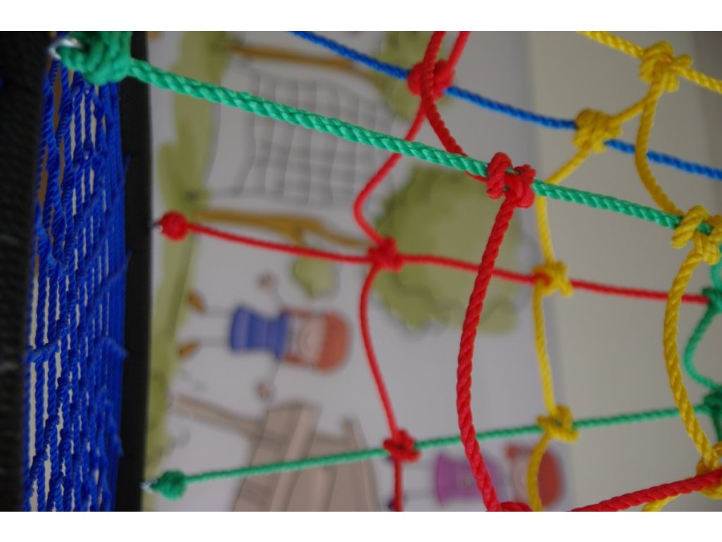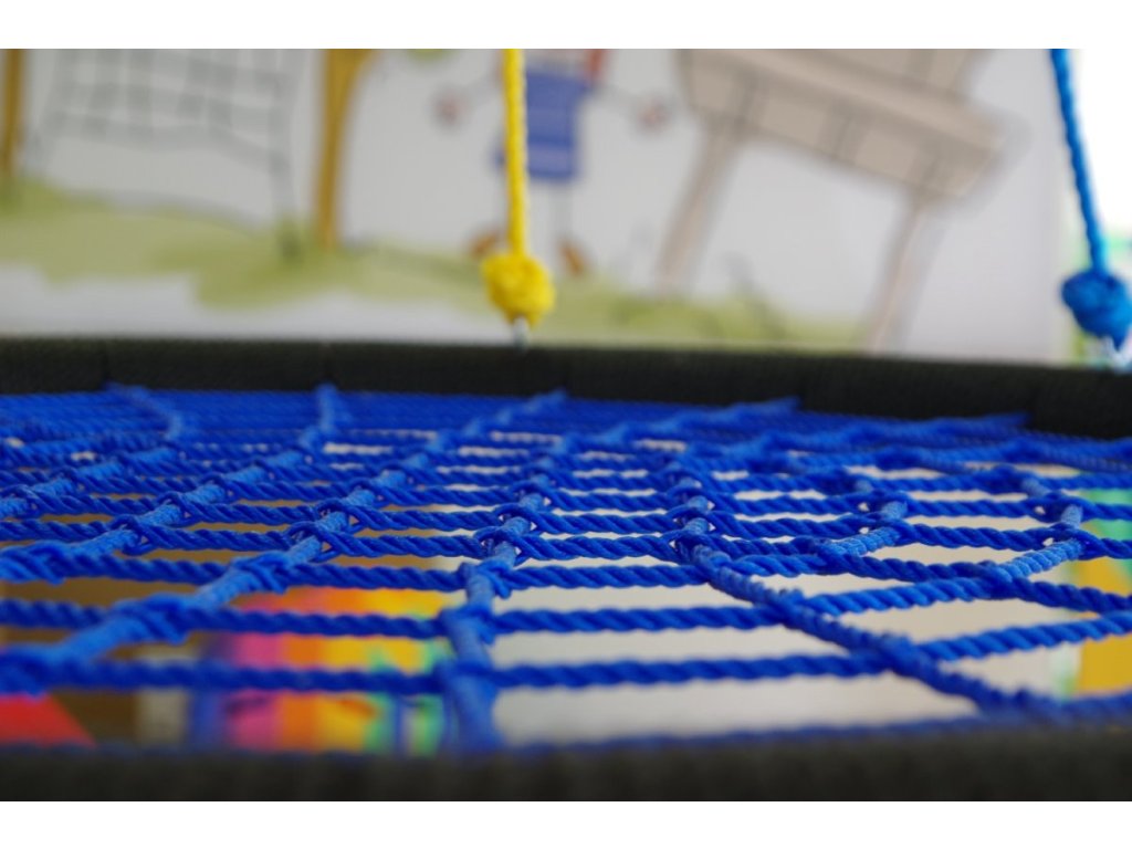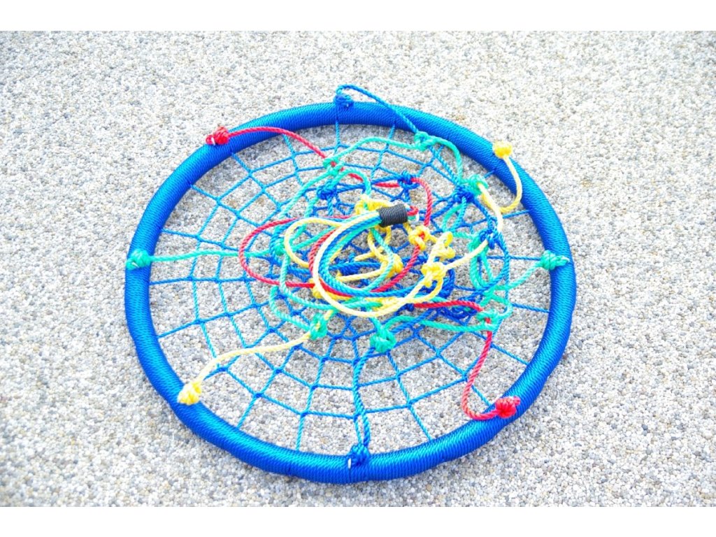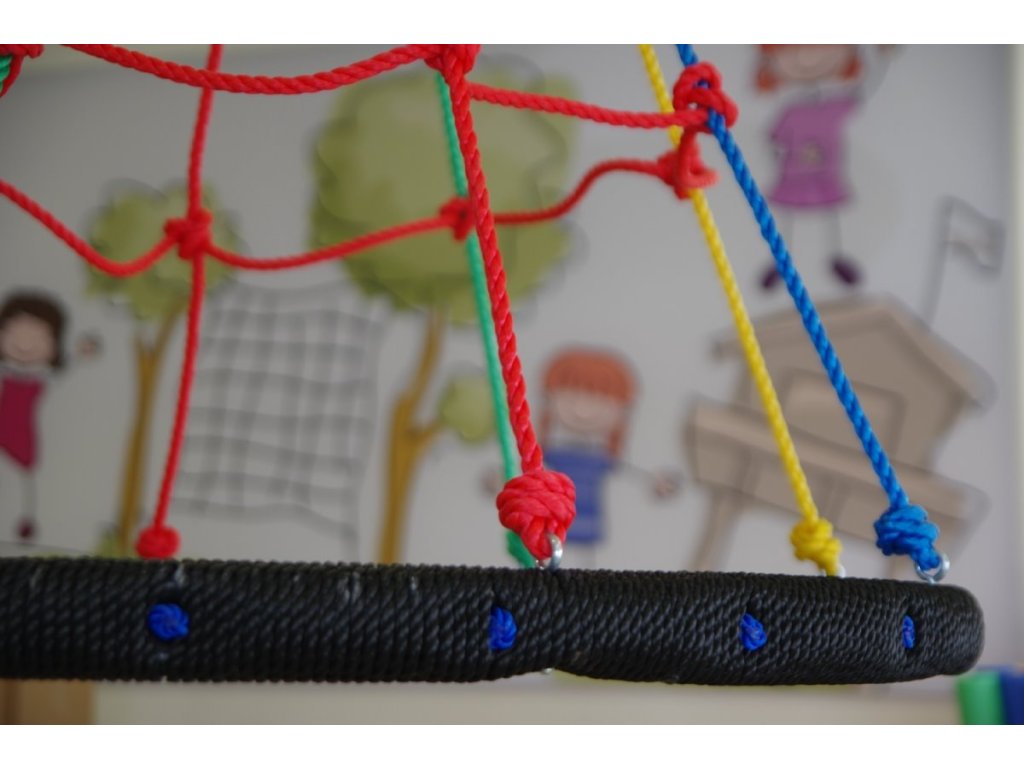 Závěsná houpačka (průměr 100 cm) s nosností 150 kg, vhodná pro děti i dospělé. Nastavitelná lana, kovový rám potažený provazem. Pro děti od 3 let. Hmotnost: 5,4 kg.