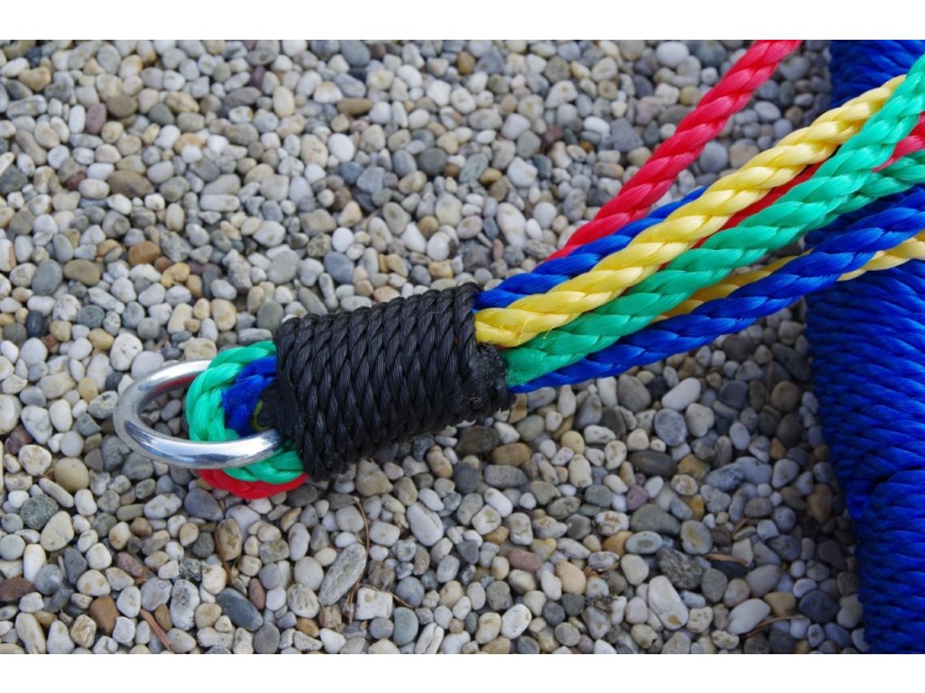 Závěsná houpačka ve tvaru kruhu je svým průměrem 100 cm a nosností až 150 kg ideální nejen pro děti, ale i dospělé. Velká sedací plocha houpačky nabízí volnost při houpání i dostatečný prostor pro lenošení. Houpačka je zavěšena na 4 délkově nastavitelných lanech, která jsou zakončena kovovými kroužky pro zavěšení na nosnou konstrukci.