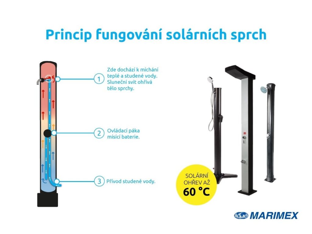 Zahradní sprcha UNO je určena pro venkovní použití pro zajištění ohřevu vody zcela zdarma za pomoci ekologického zdroje ohřevu - sluneční energie, kdy její tělo zároveň slouží jako solární kolektor. Pojme až 20 l vody. Pro sprchování musí být zahradní sprcha stále napojena na vodovodní řad. Není-li napojena, nelze se sprchovat. Horní sprchovací hlavice je vybavena kloubem pro polohování. Pokud je sprcha odpojena a je uzavřen ventil, nedochází k úniku vody. Sprcha se kotví pomocí 4 šroubů (nejsou součástí balení) pevně k zemi, čímž je zajištěna její perfektní stabilita.