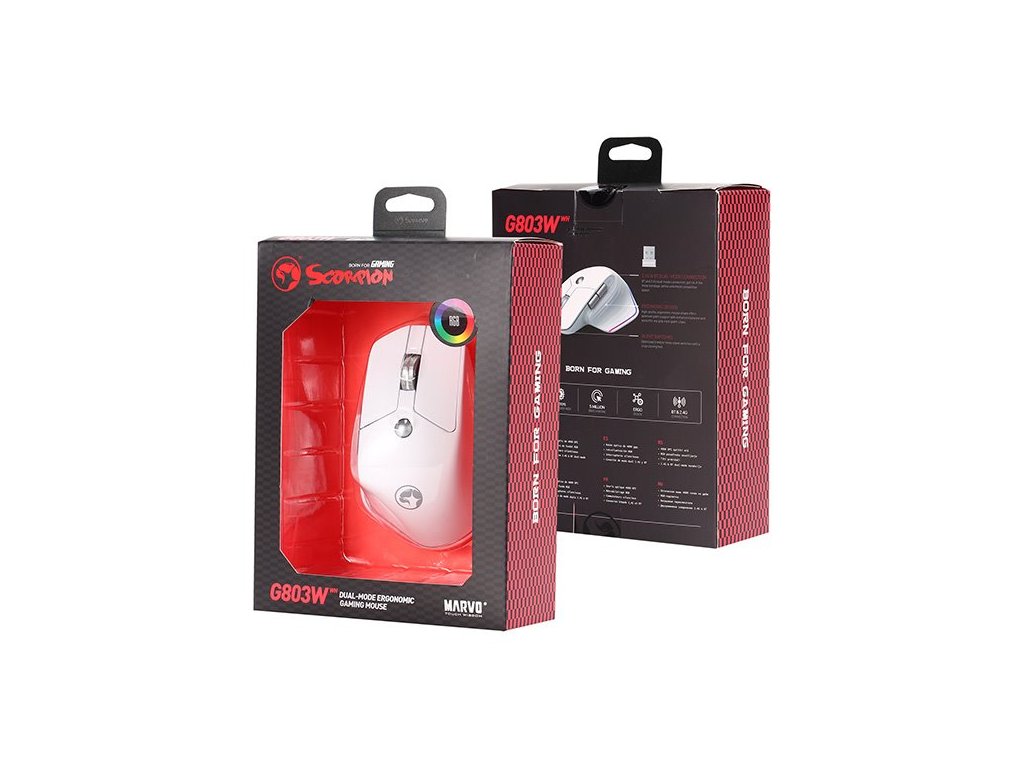 Marvo G803 s ergonomickým designem, výkonným chipsetem, dual-mode režimem připojení, nastavitelným DPI, tichými tlačítky a stylovým RGB podsvícením se stane vaším nenahraditelným pomocníkem při práci i zábavě.