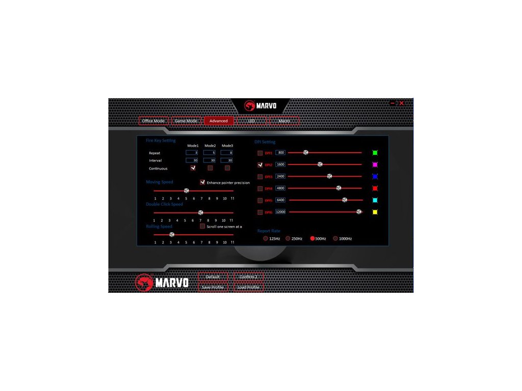 Defaultně je rozlišení nastaveno v hodnotách 800-1600-2400-4800-6400-12000. Přes software můžete nastavit libovolné přepnutí mezi úrovněmi od 800 do 12000 dpi. Nastavit si mimo jiné můžete i podsvícení, rychlost, jas i režim LED efektů. Dolaďte si myš k dokonalosti!