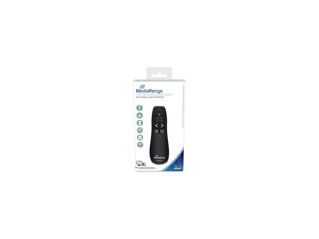Prezentační dálkový ovladač MediaRange s červeným laserovým ukazovátkem a praktickými navigačními tlačítky je ideální pro profesionální přednášky a prezentace v kancelářích, školách nebo přednáškových sálech. Kompaktní a stylové dálkový ovladač může být připojen k vašemu počítači přes USB přijímač s podporou Plug & Play a umožňí vám dosah až 15 metrů.
